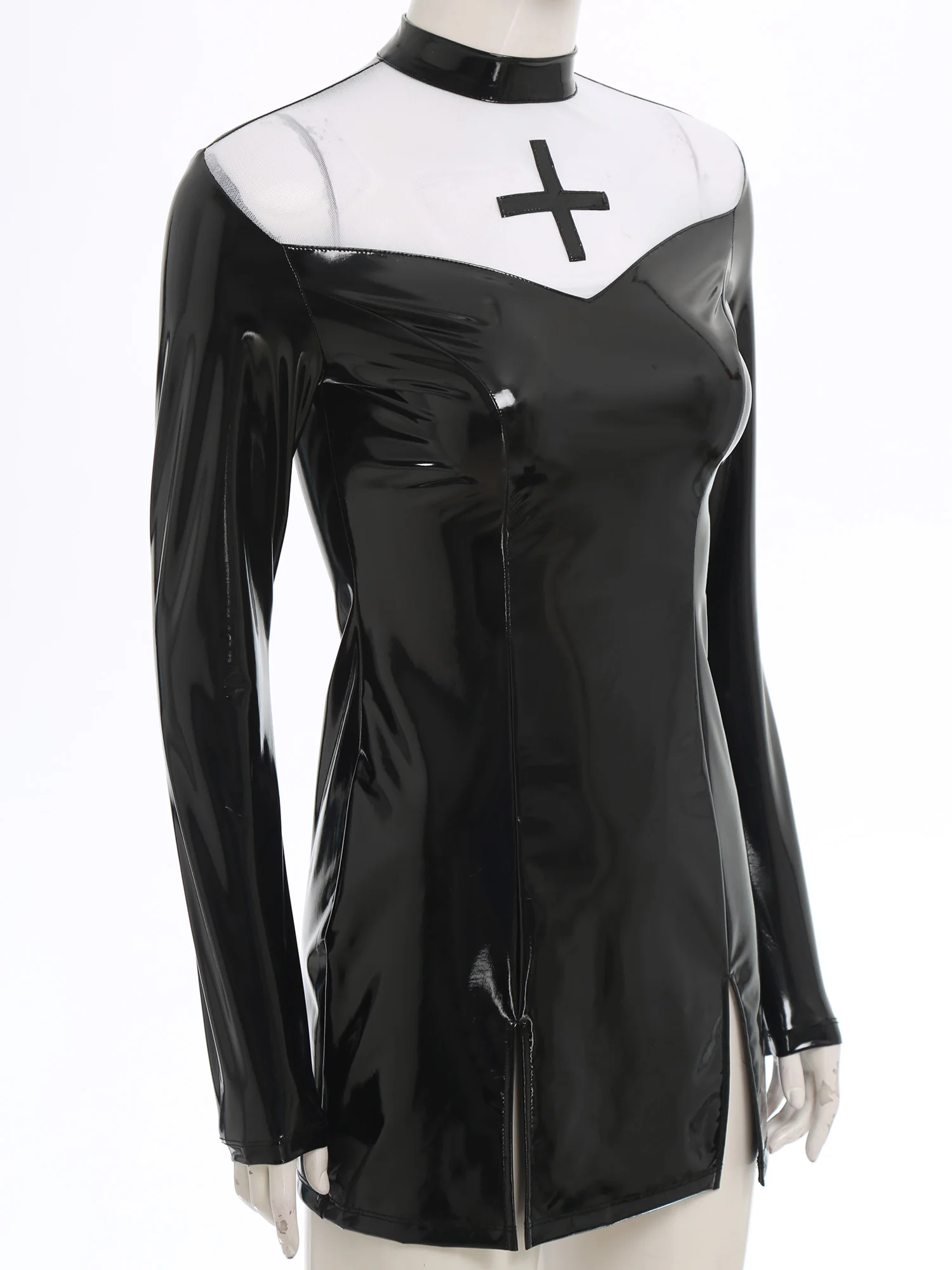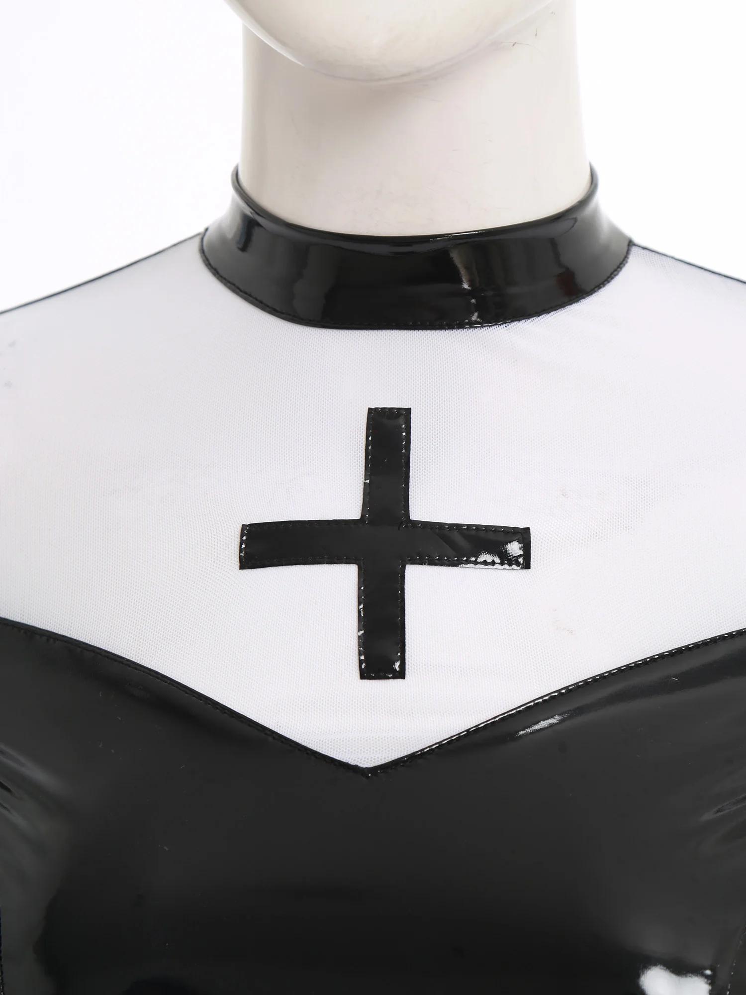Womens Nun Sister Cosplay Religious Catholic Priest Halloween Costume Leather Slit Hem Latex Mini Bodycon Dress Mesh with Cross