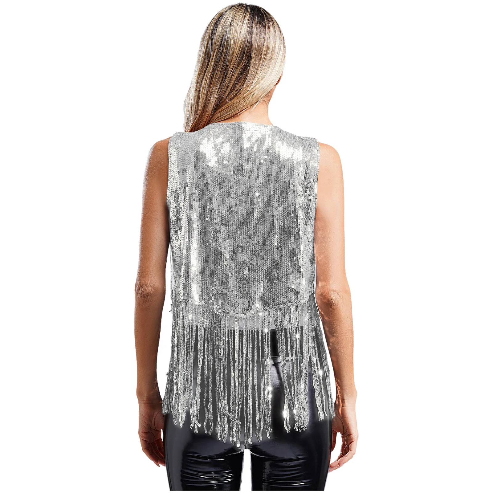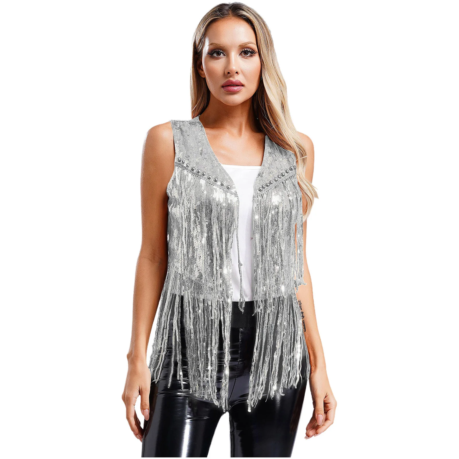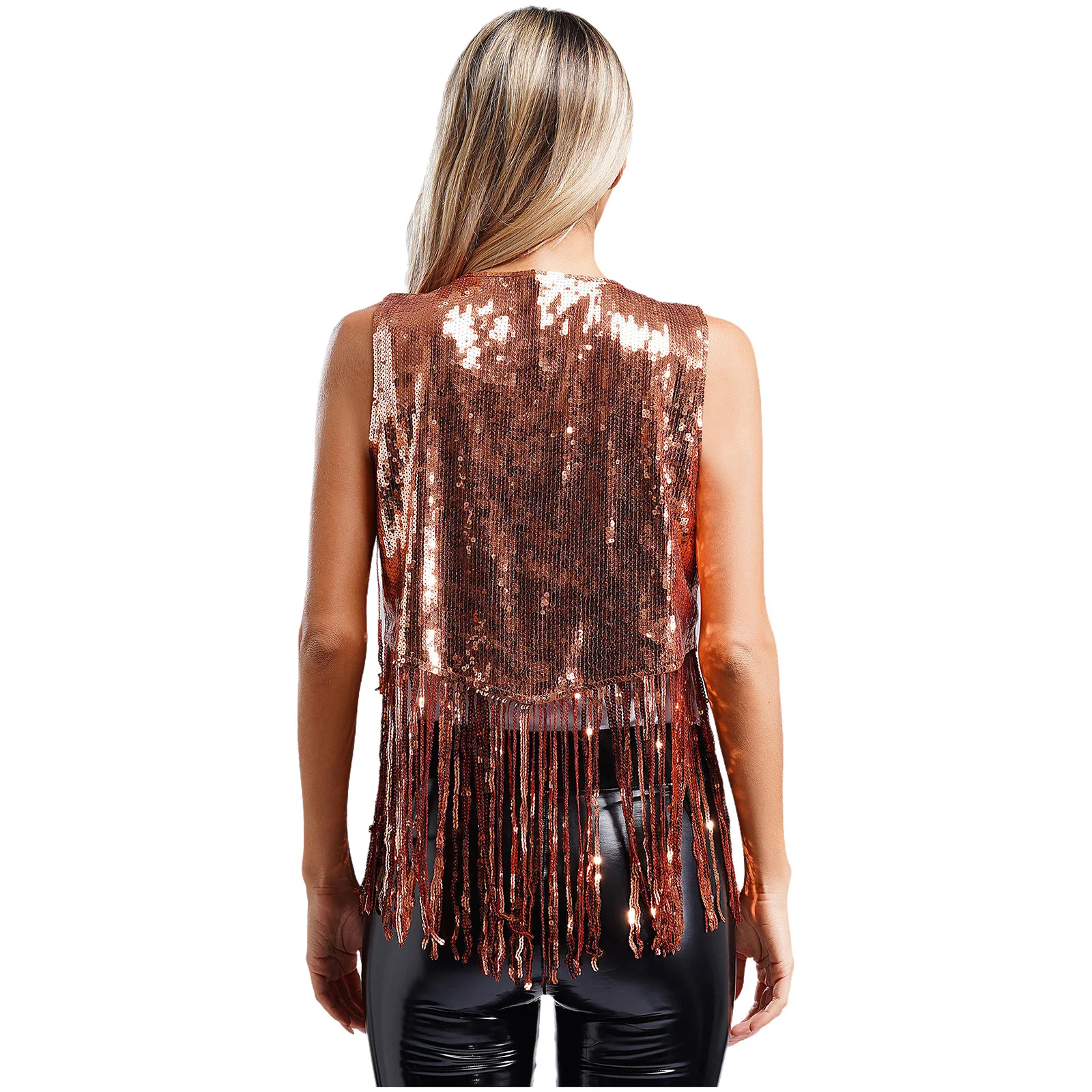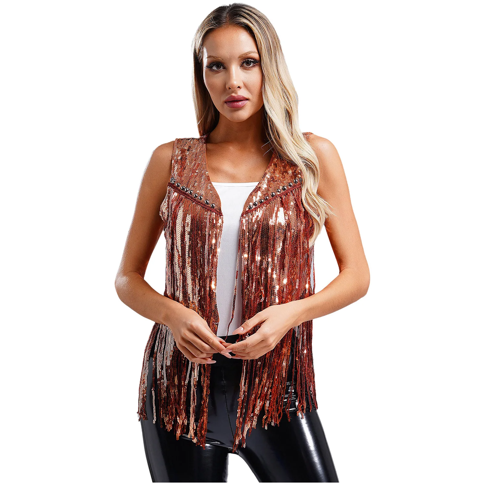Womens Open Front Tassel Rivets Vest Cardigan 70s Disco Pole Jazz Dance Costume Sequin Cowgirl Waistcoat Bolero Gothic Clubwear