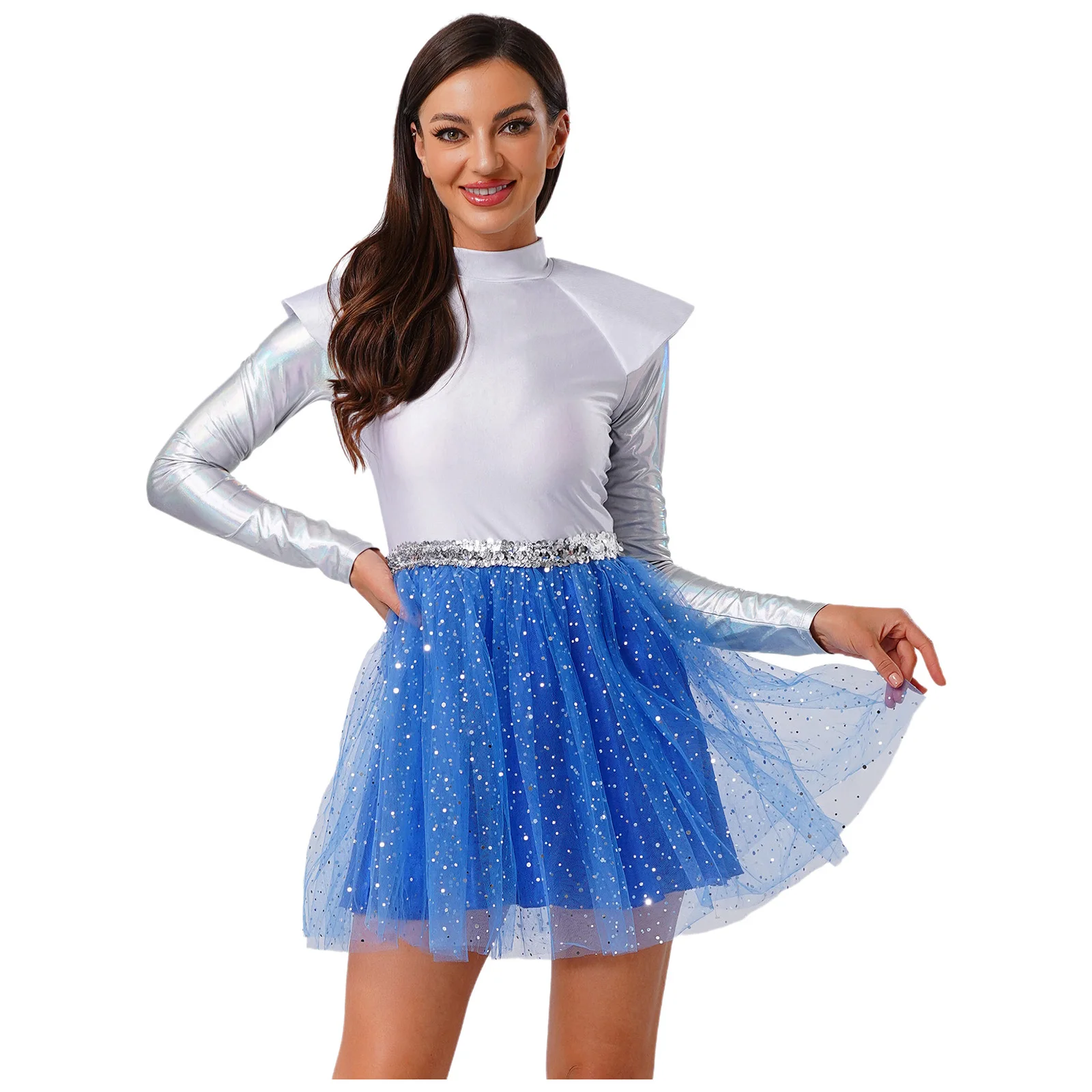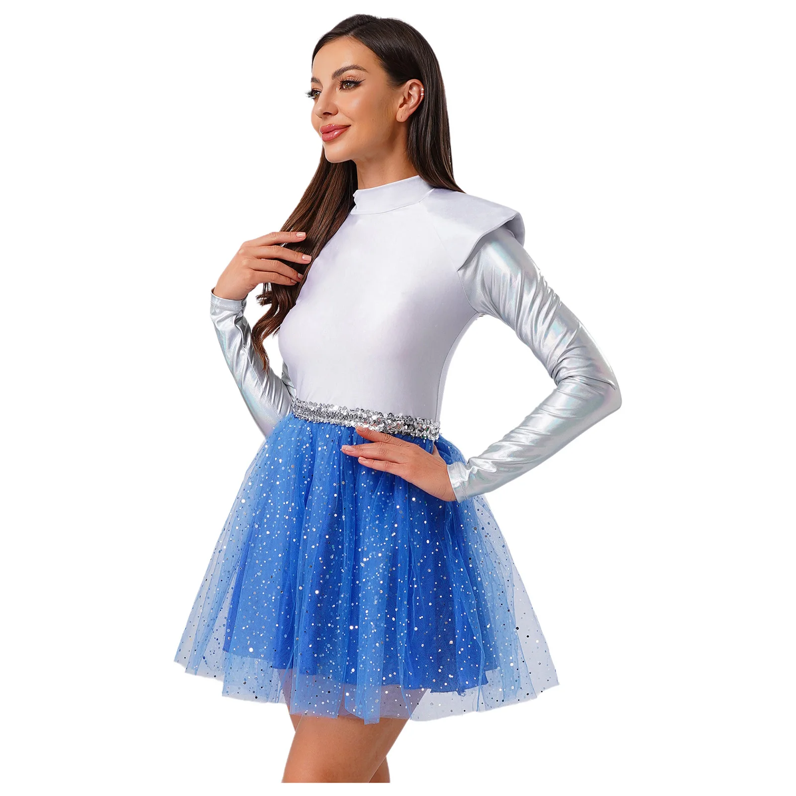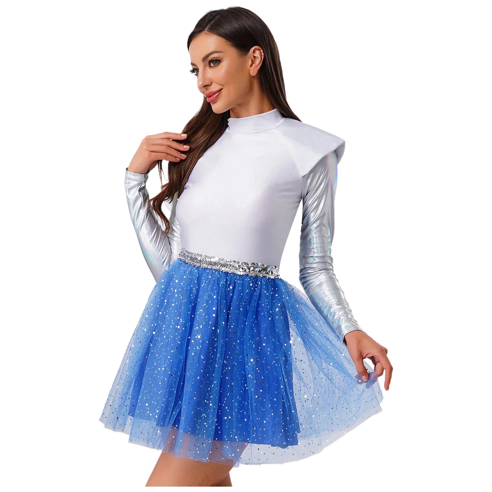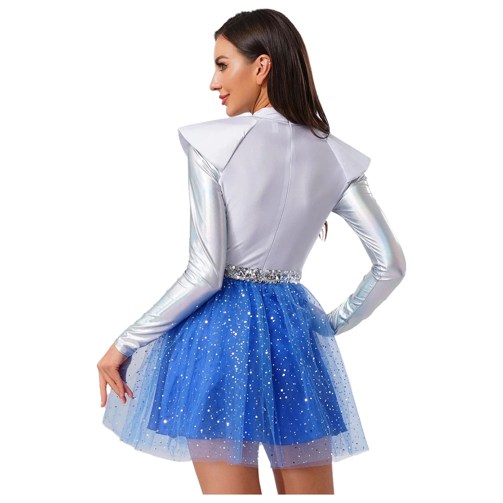 Womens Outer Space Alien Astronaut Cosplay Outfits Fighter Alien Robot Halloween Costume Metallic Shiny Tulle Hem Robot Dress