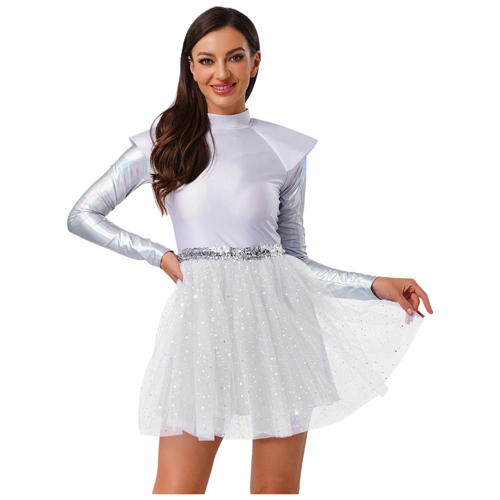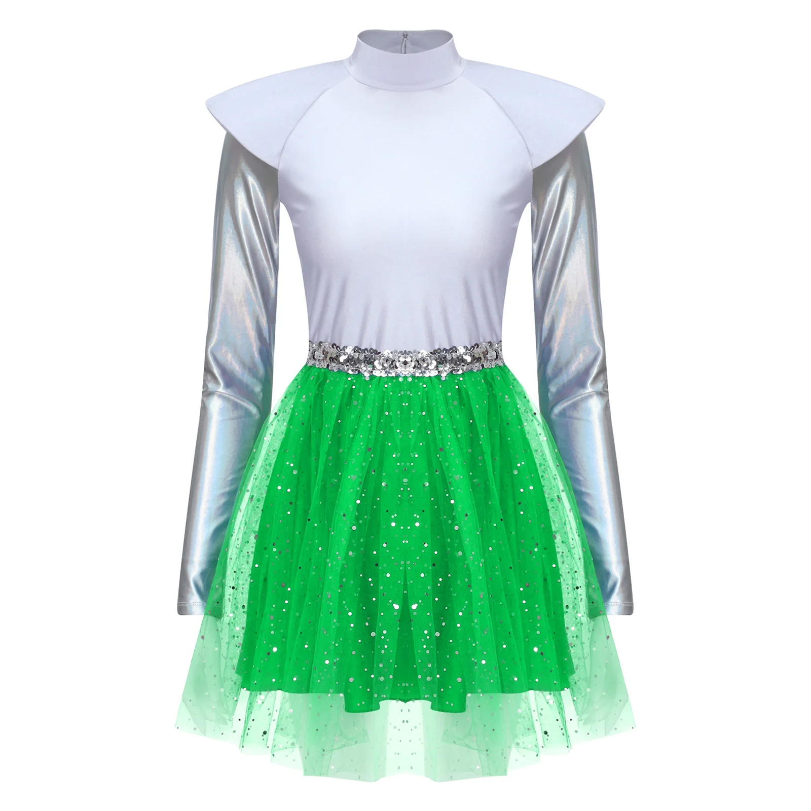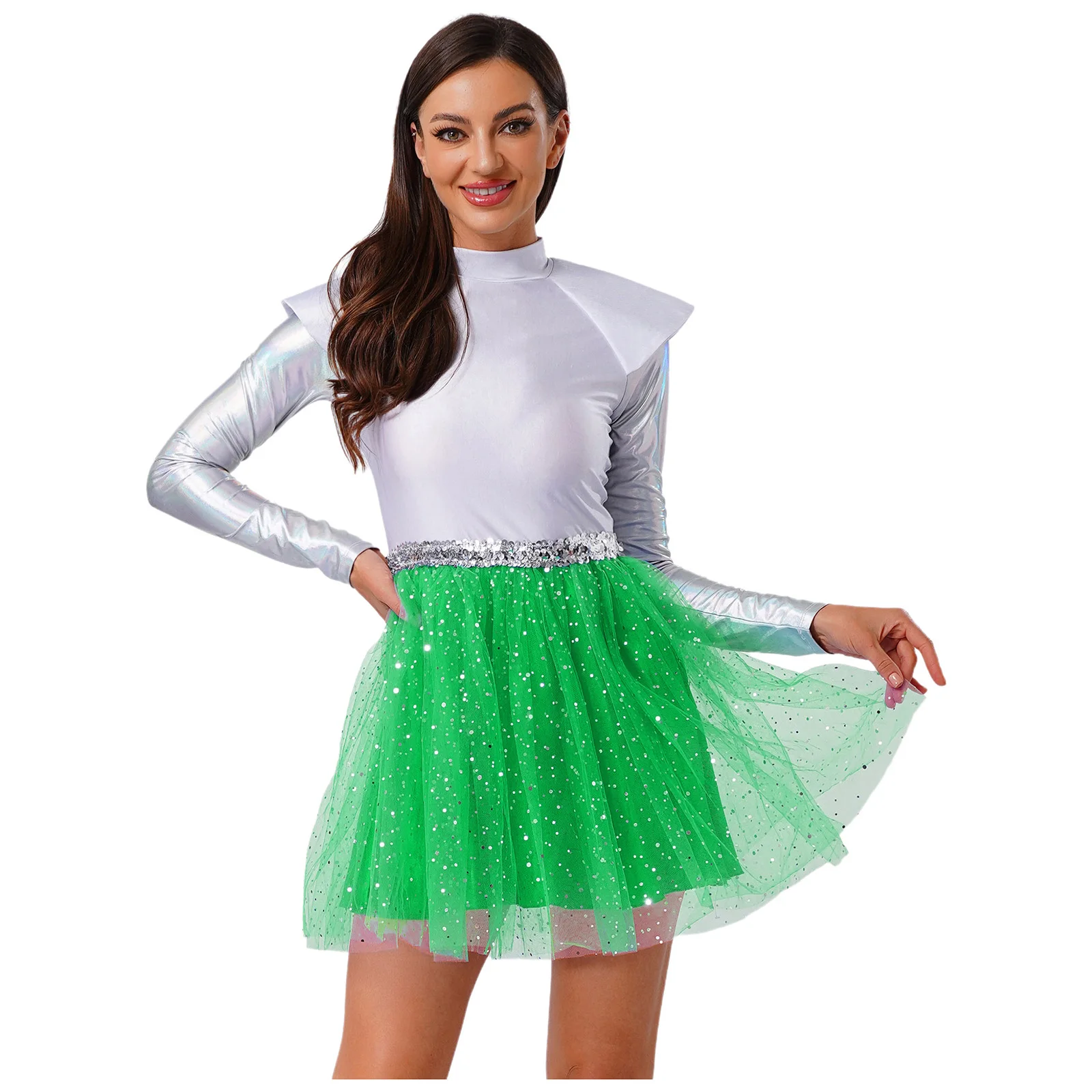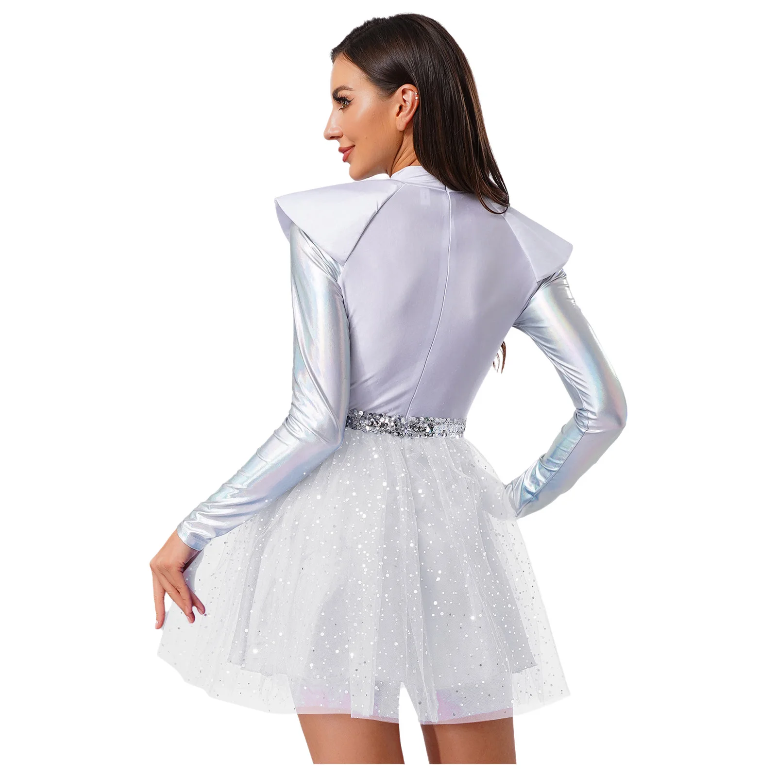 Womens Outer Space Alien Astronaut Cosplay Outfits Fighter Alien Robot Halloween Costume Metallic Shiny Tulle Hem Robot Dress