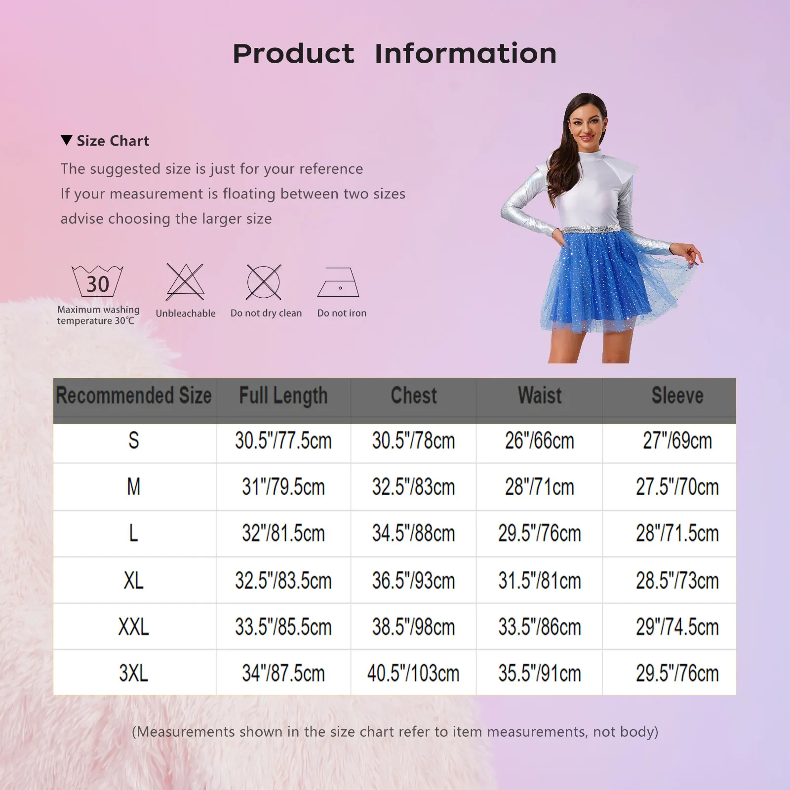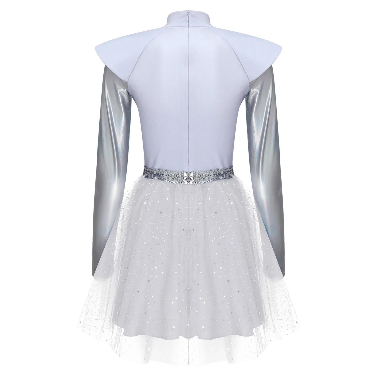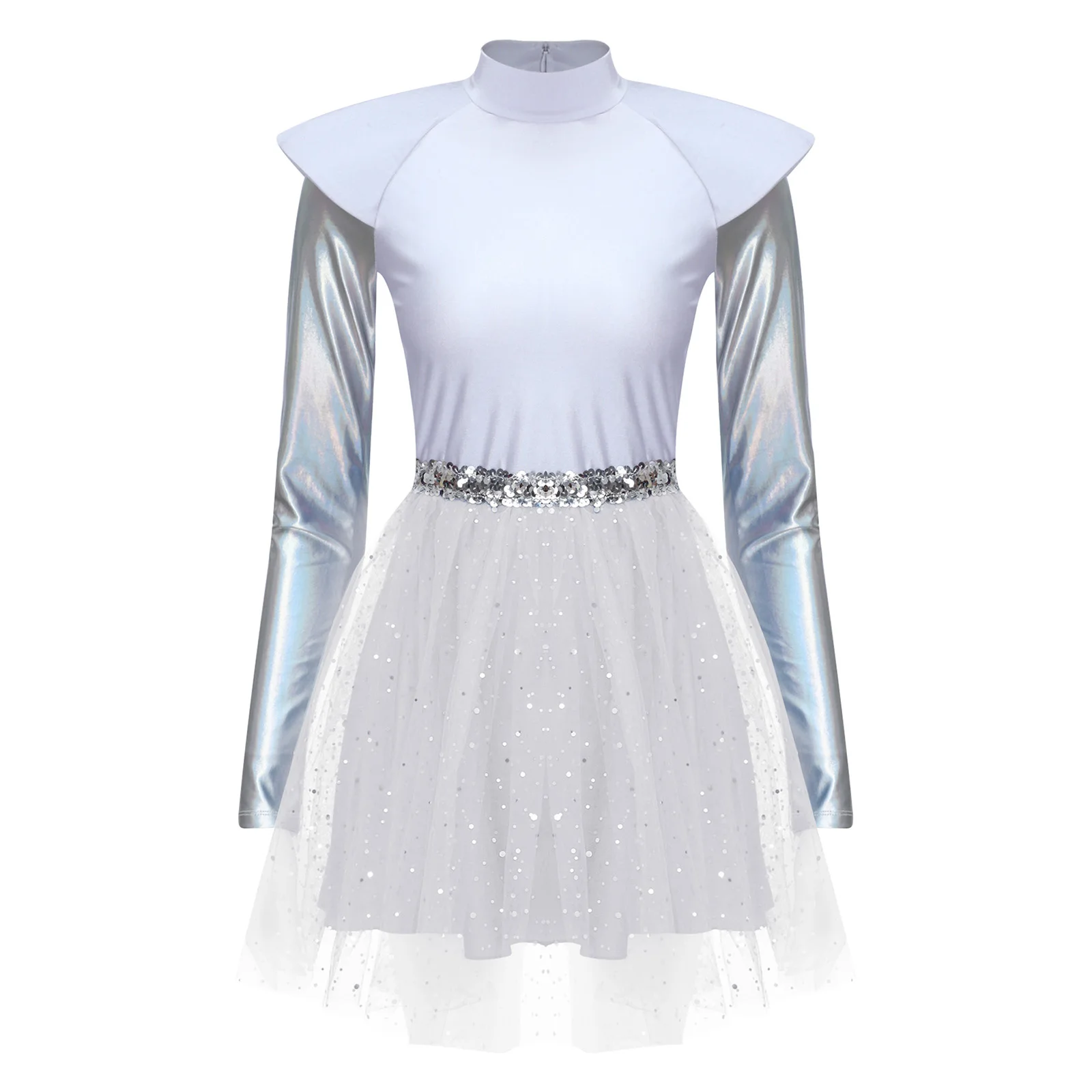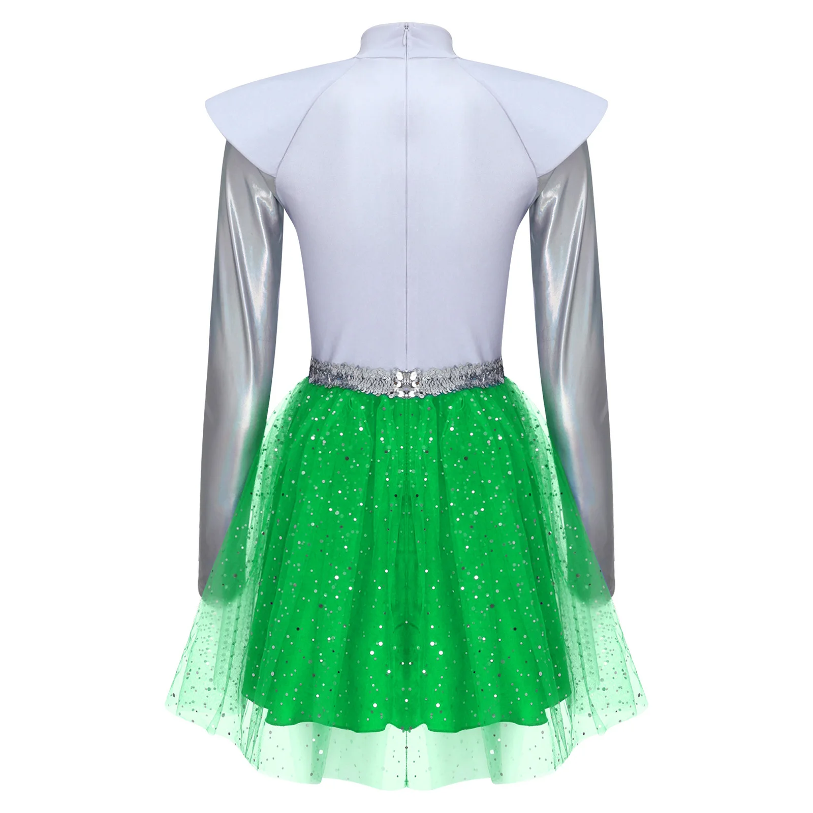Womens Outer Space Alien Astronaut Cosplay Outfits Fighter Alien Robot Halloween Costume Metallic Shiny Tulle Hem Robot Dress
