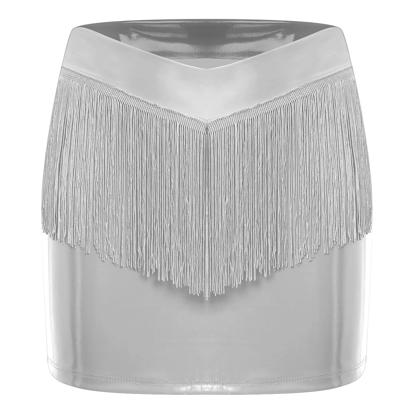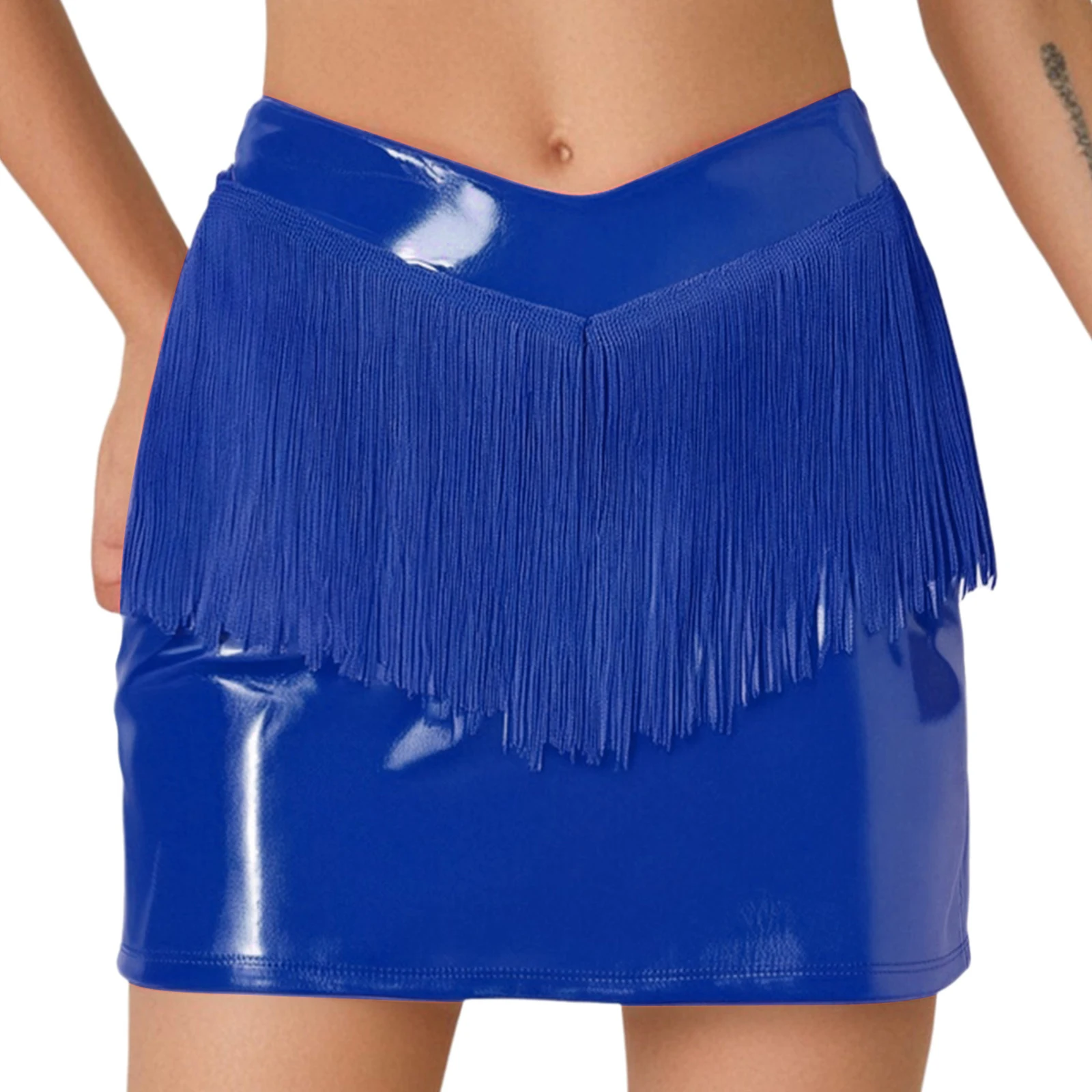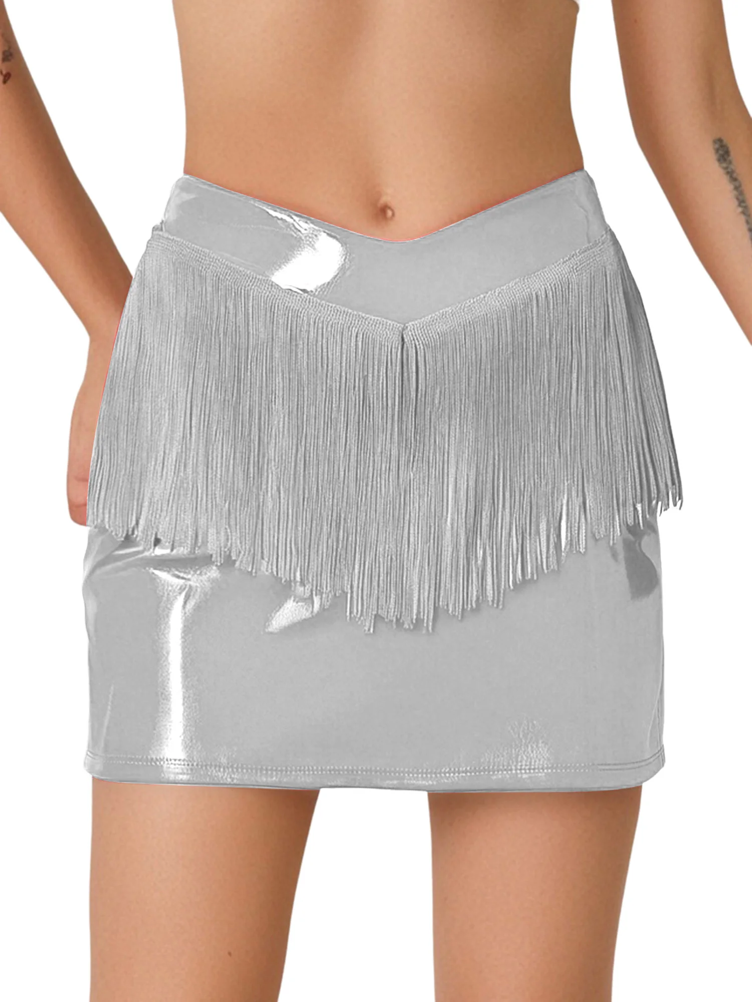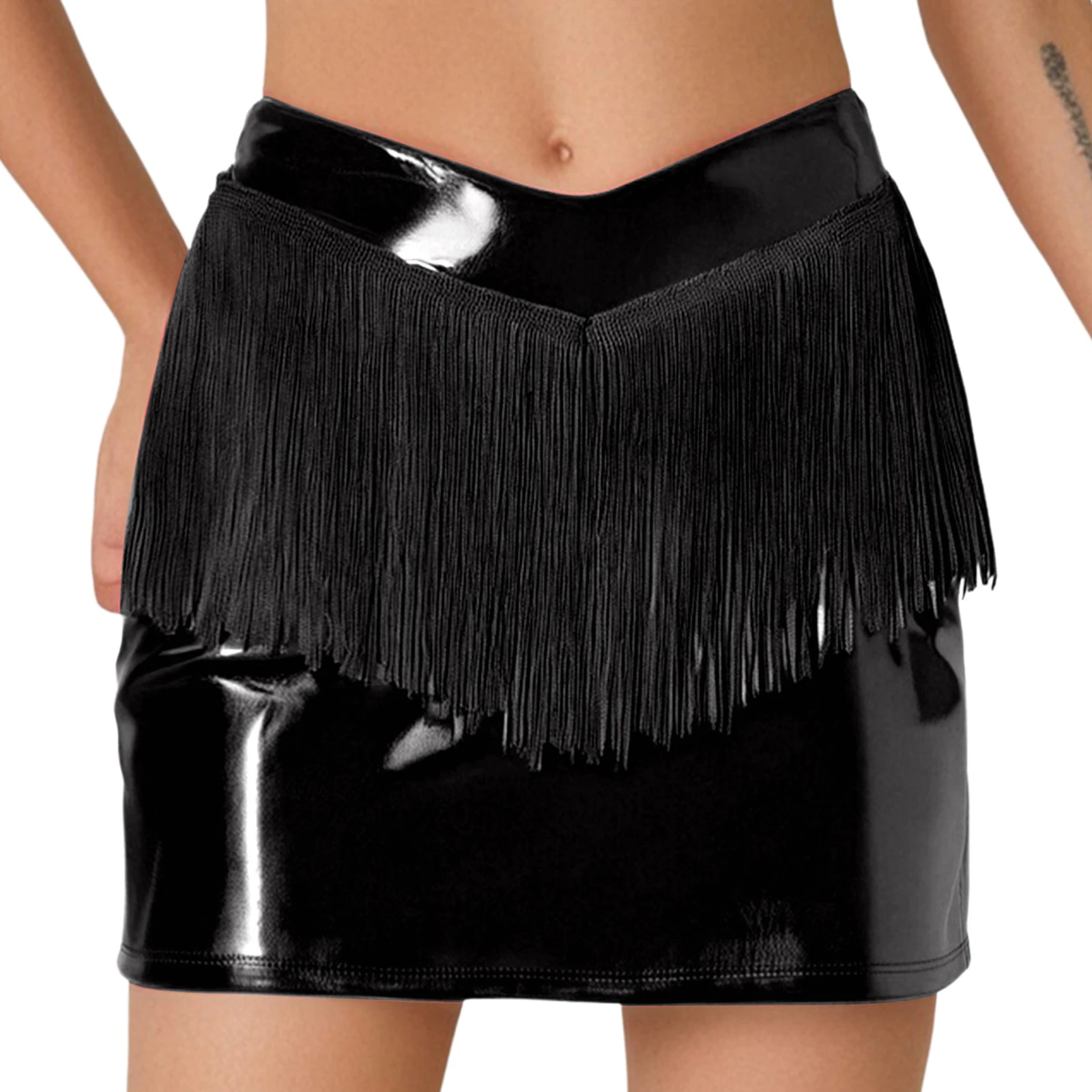 Womens Patent Leather Fringed Skirt V-Front Side Invisible Zipper Miniskirt Club Pole Dance Rave Party Music Festival Outfits
