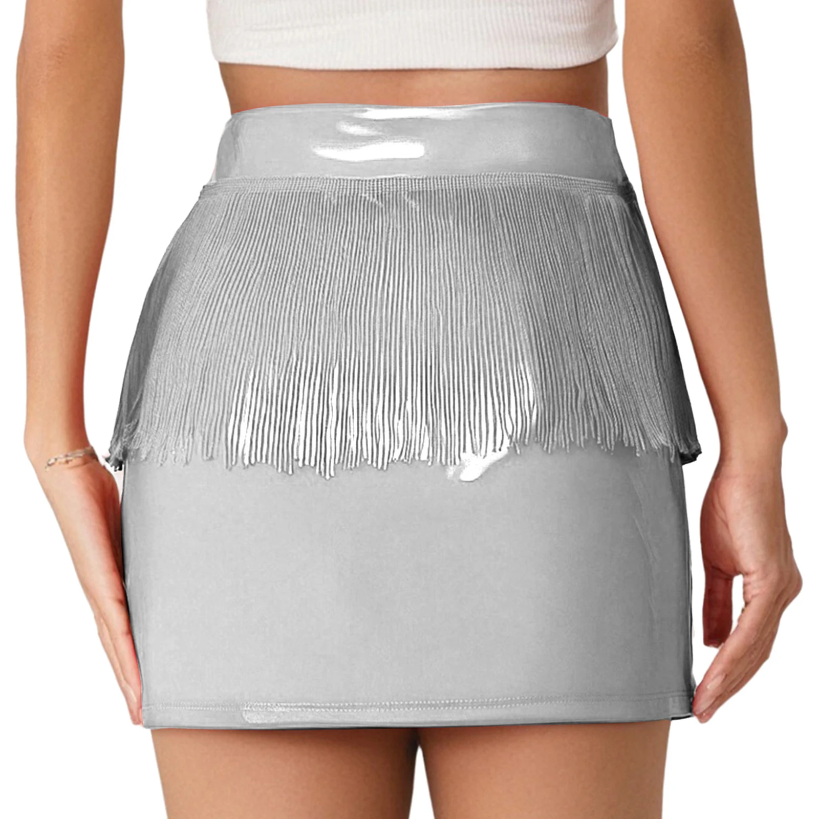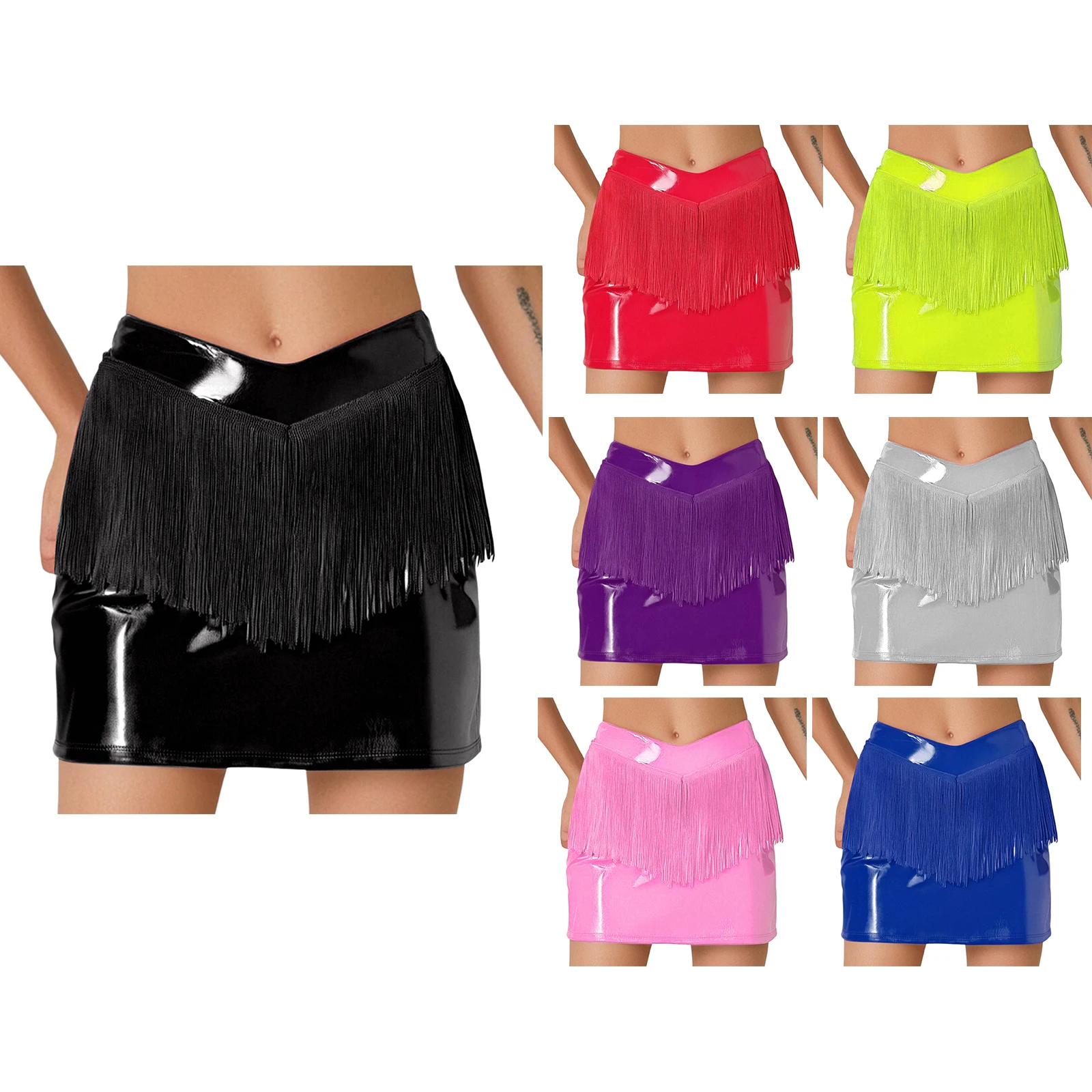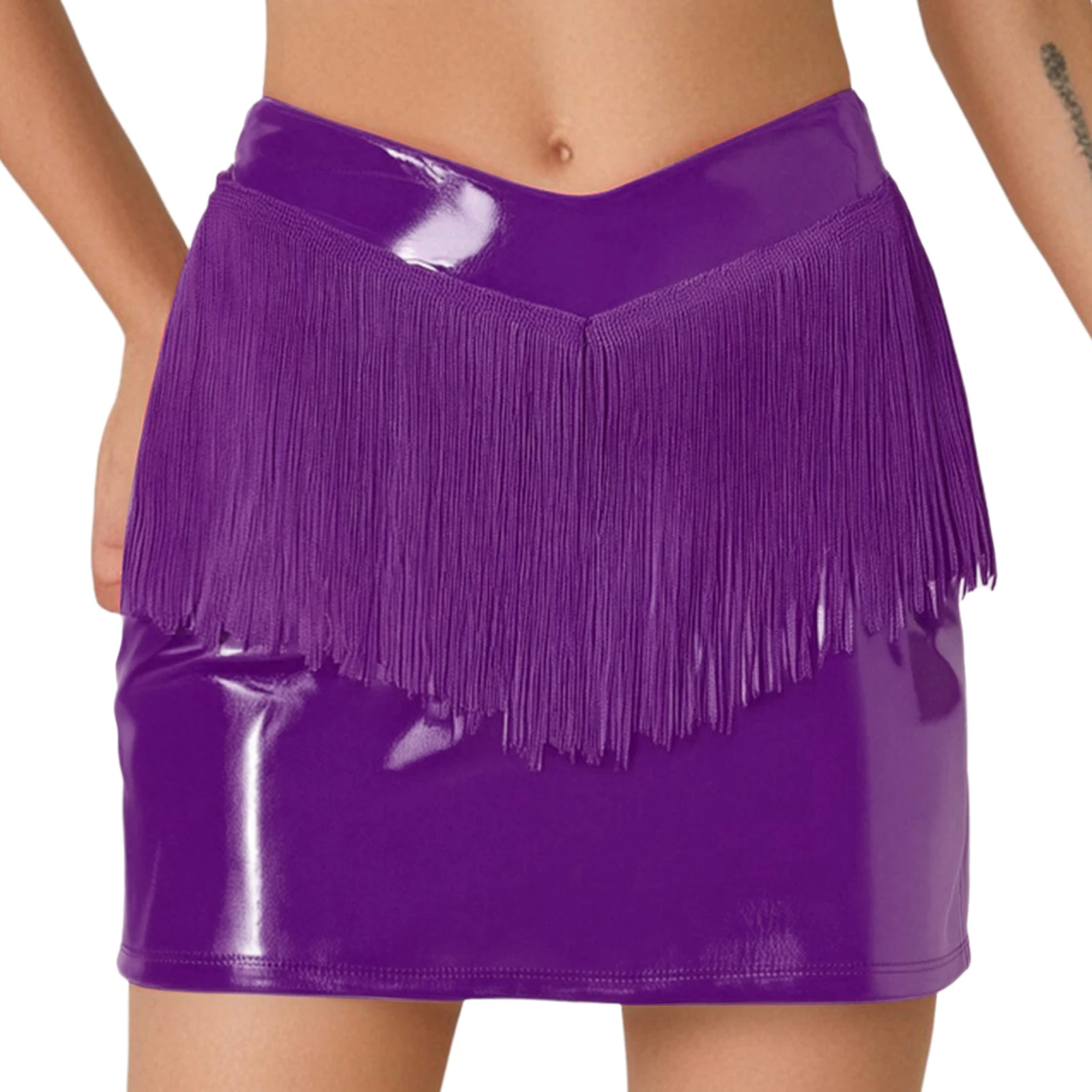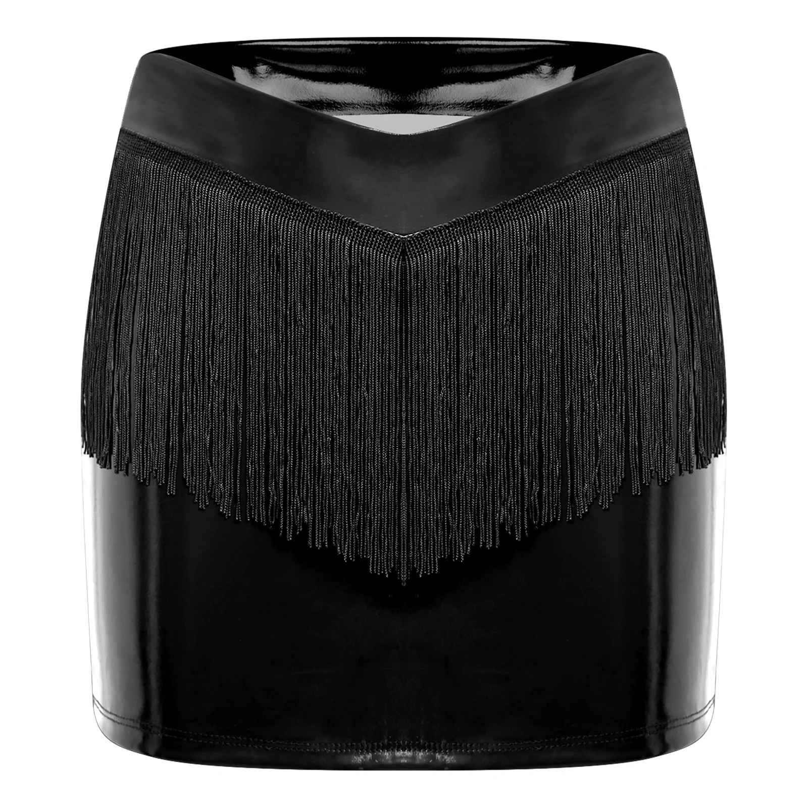 Womens Patent Leather Fringed Skirt V-Front Side Invisible Zipper Miniskirt Club Pole Dance Rave Party Music Festival Outfits