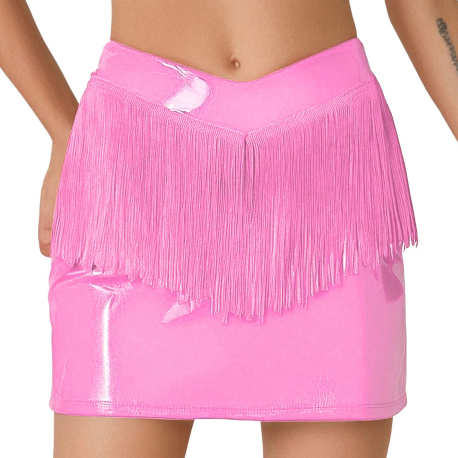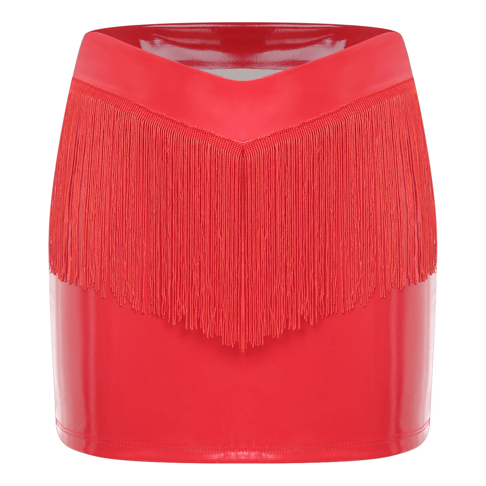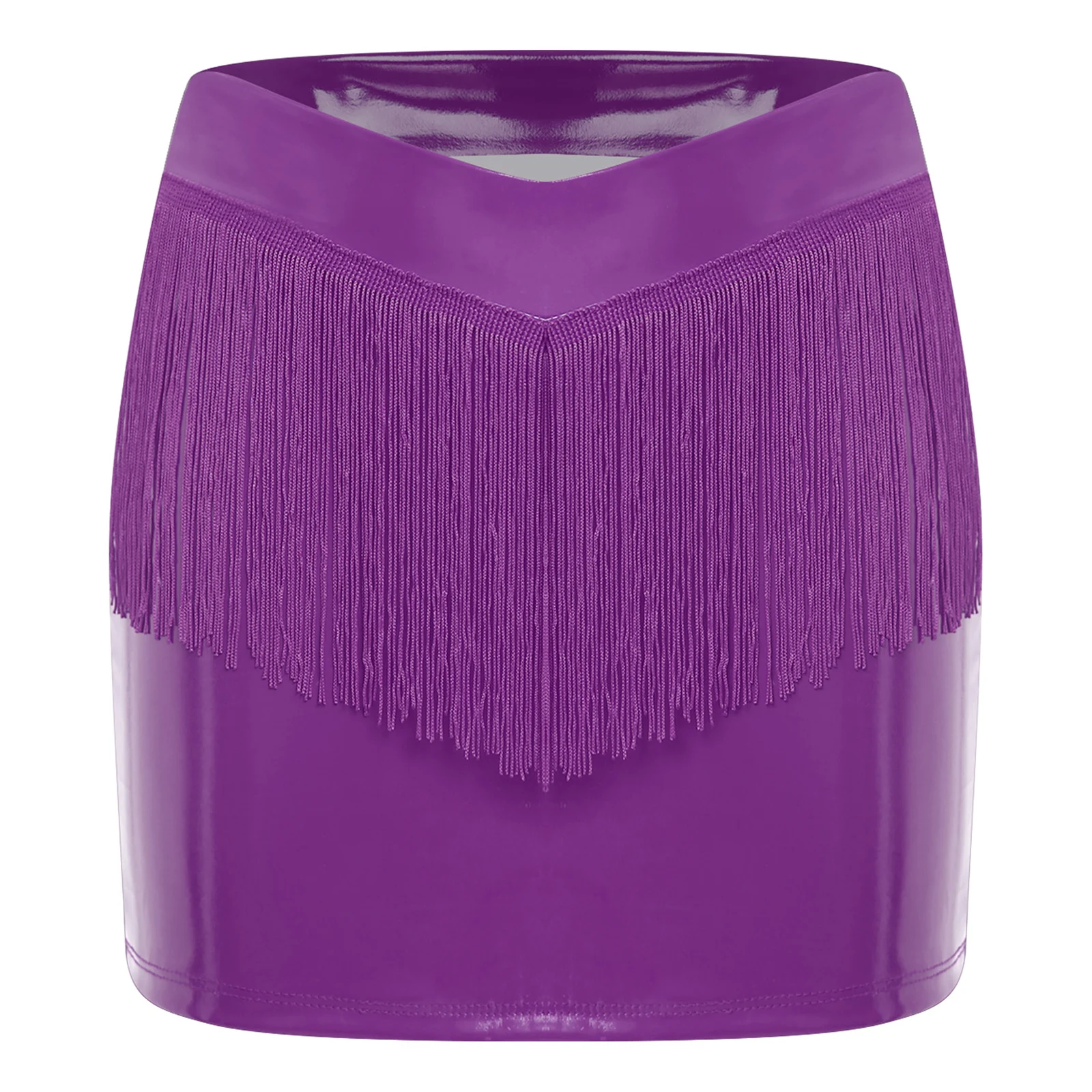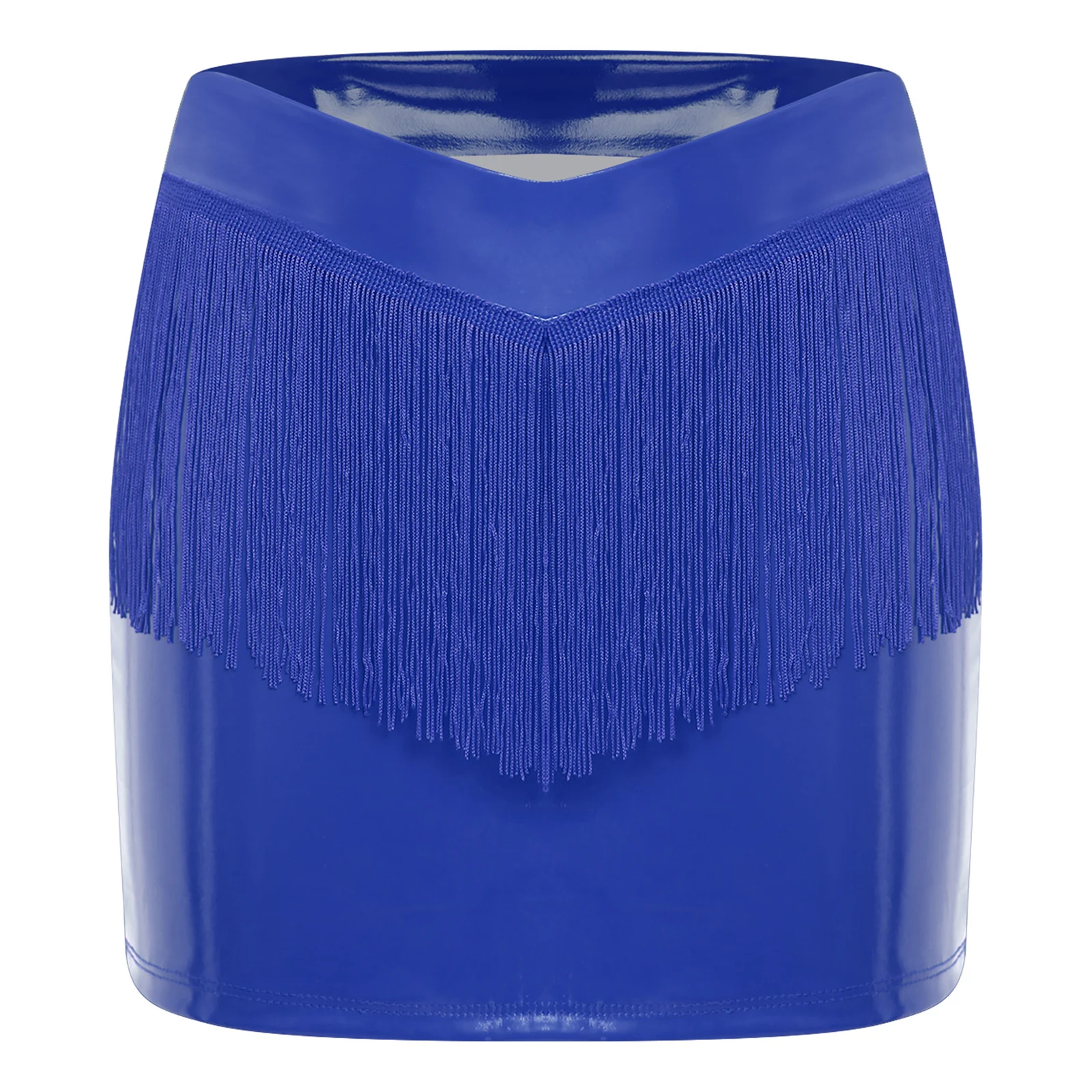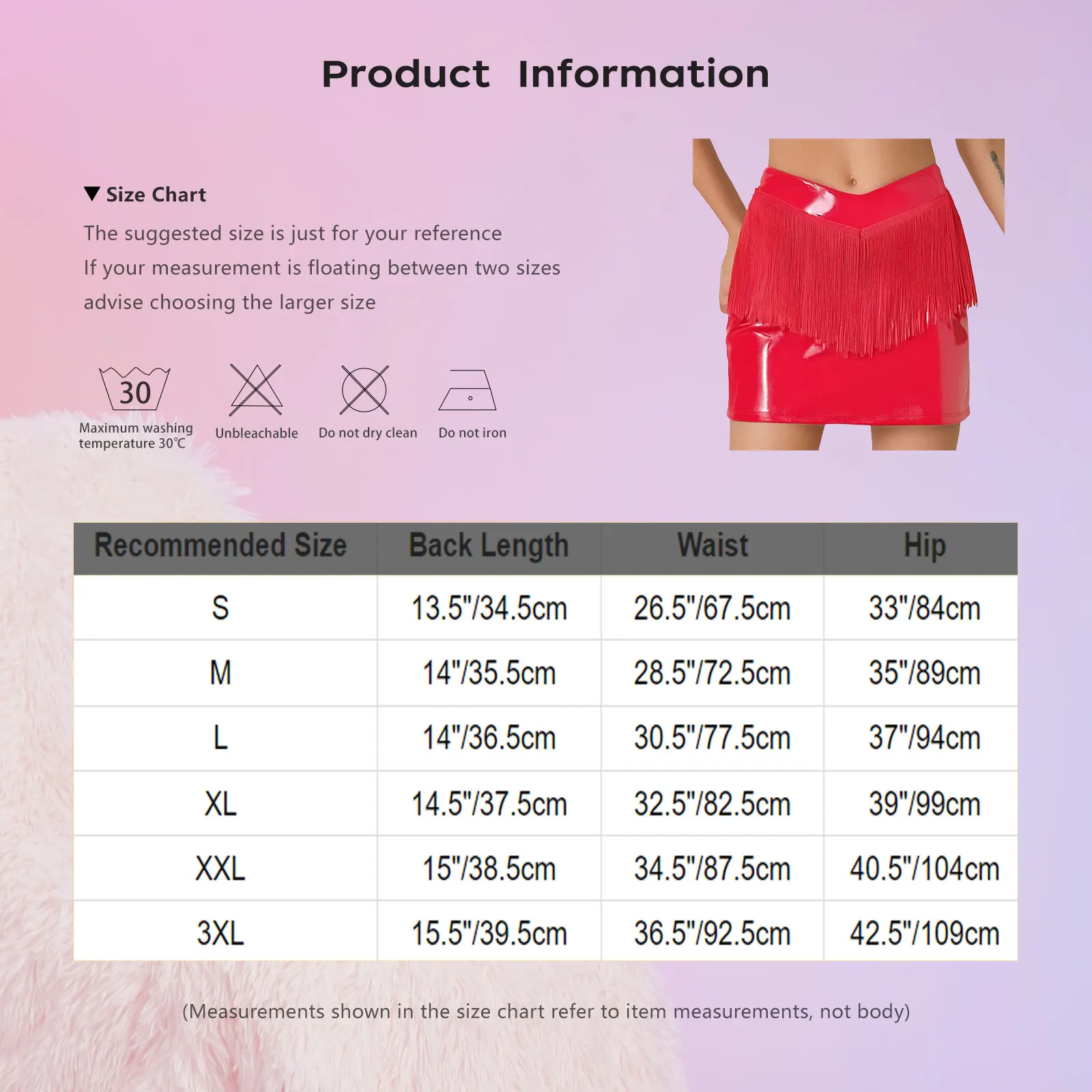 Womens Patent Leather Fringed Skirt V-Front Side Invisible Zipper Miniskirt Club Pole Dance Rave Party Music Festival Outfits