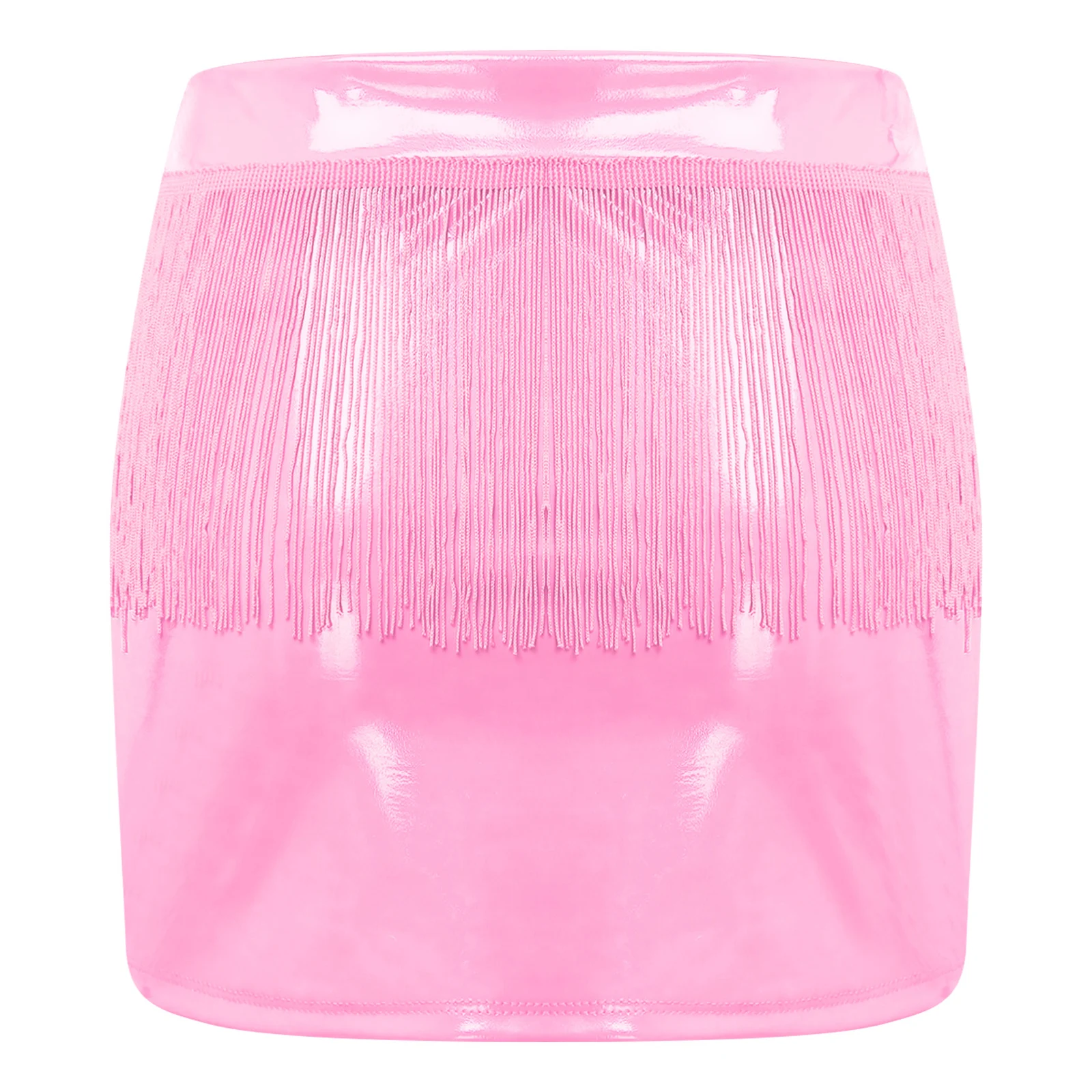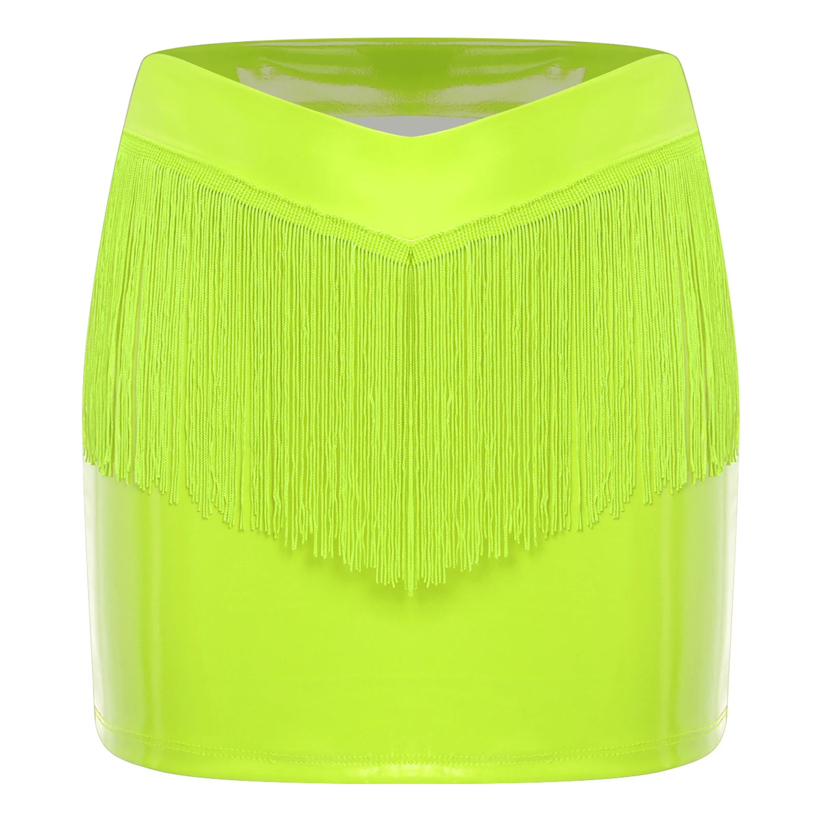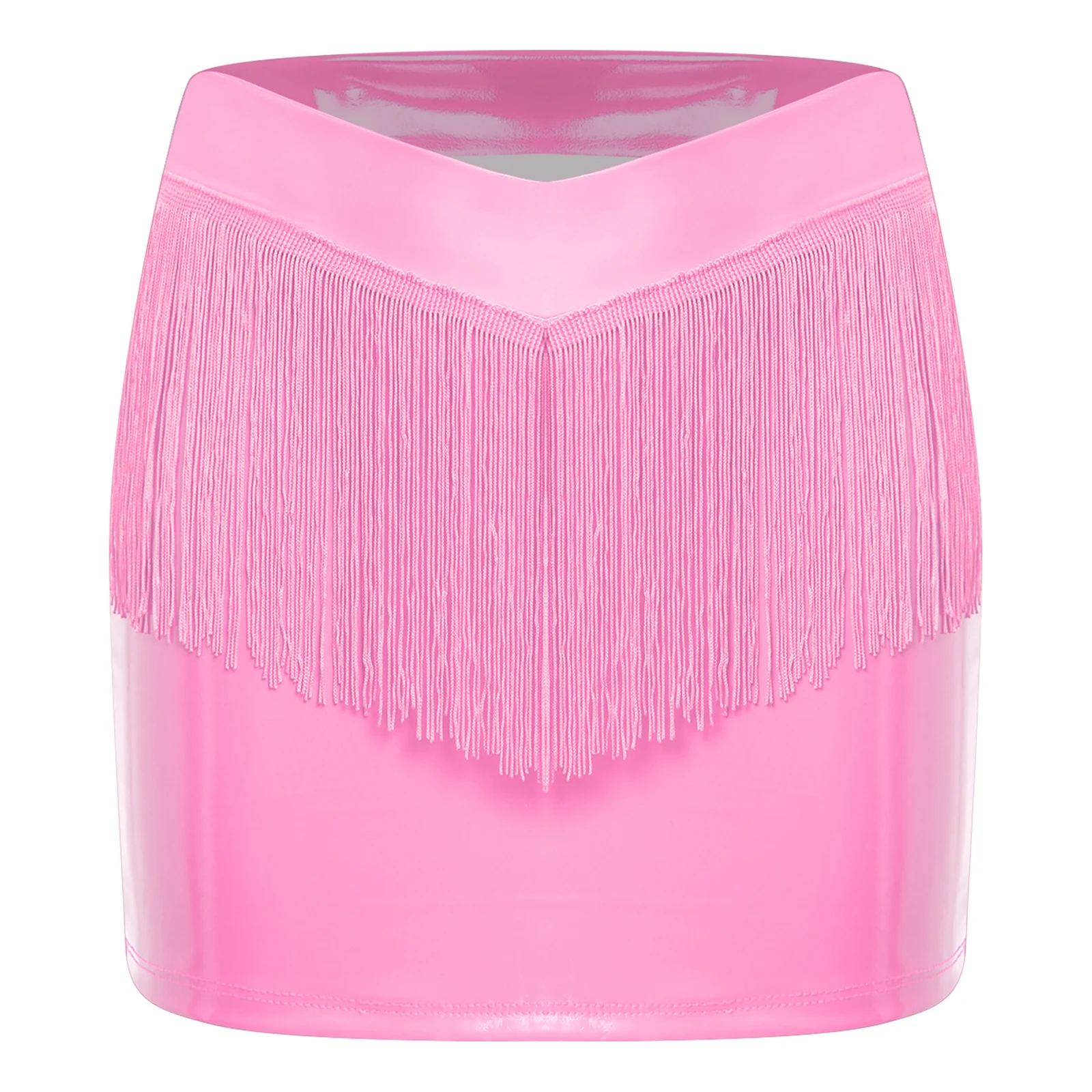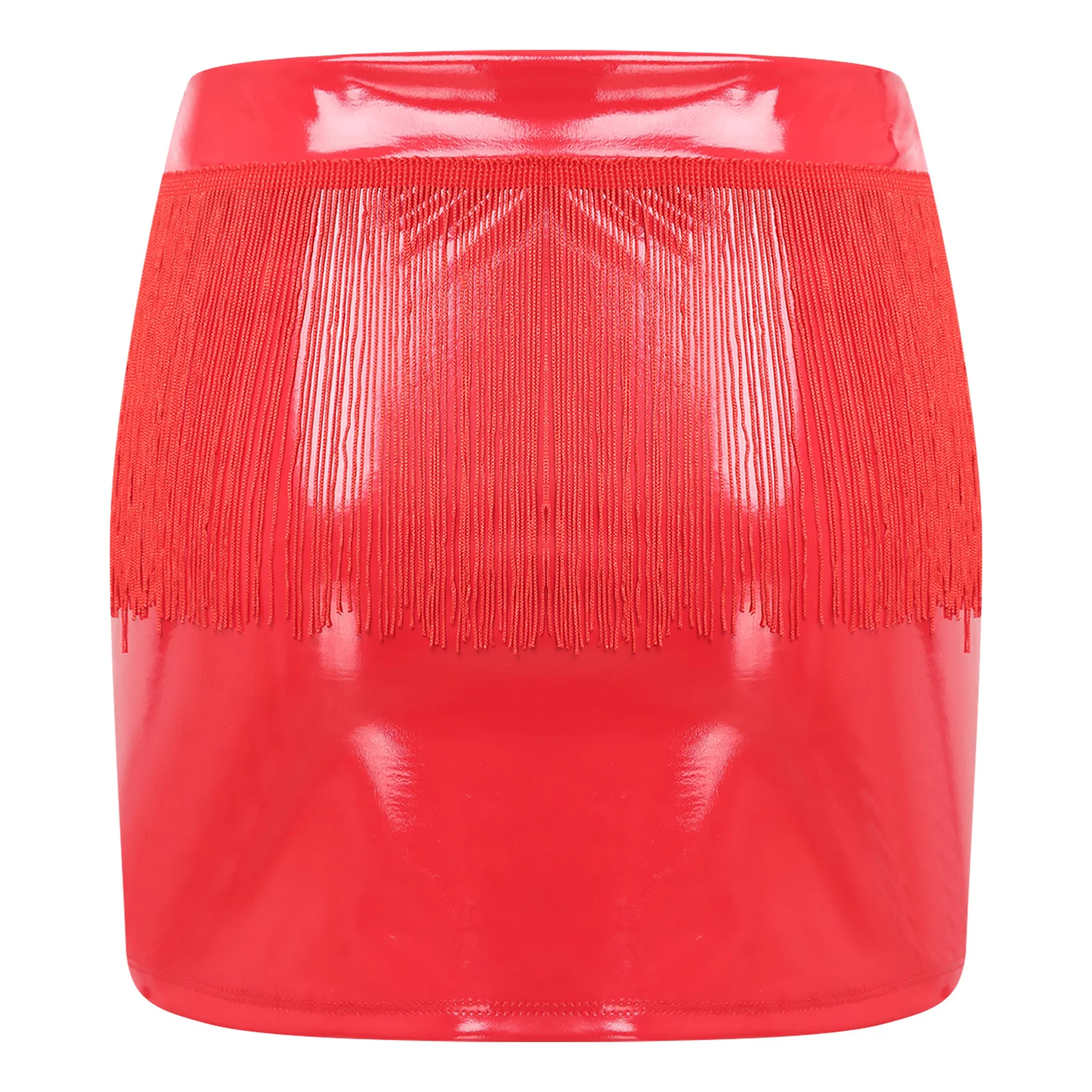 Womens Patent Leather Fringed Skirt V-Front Side Invisible Zipper Miniskirt Club Pole Dance Rave Party Music Festival Outfits