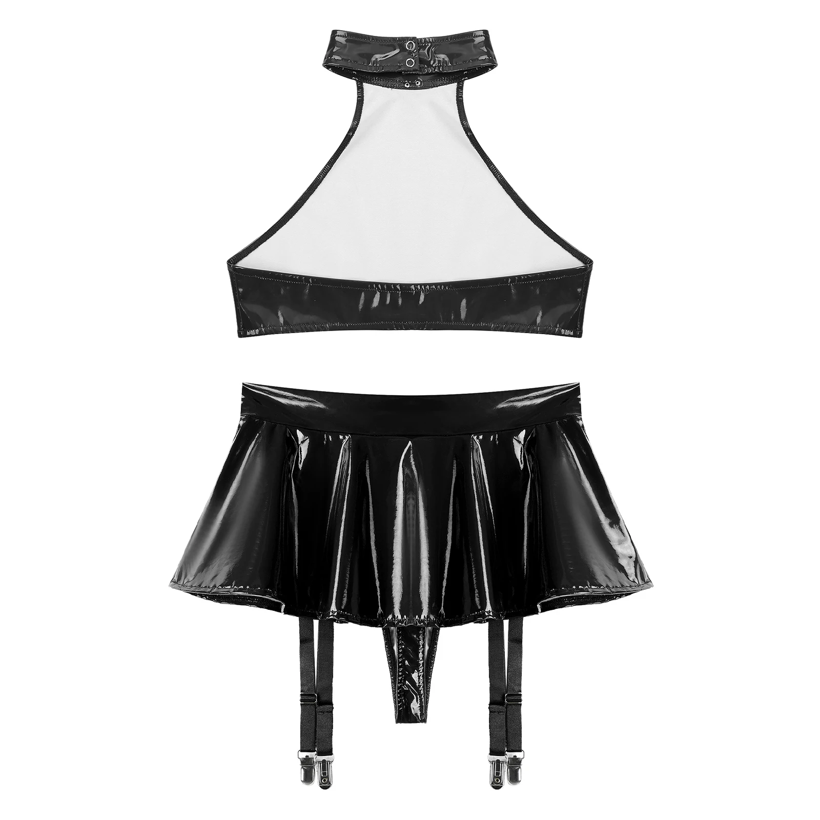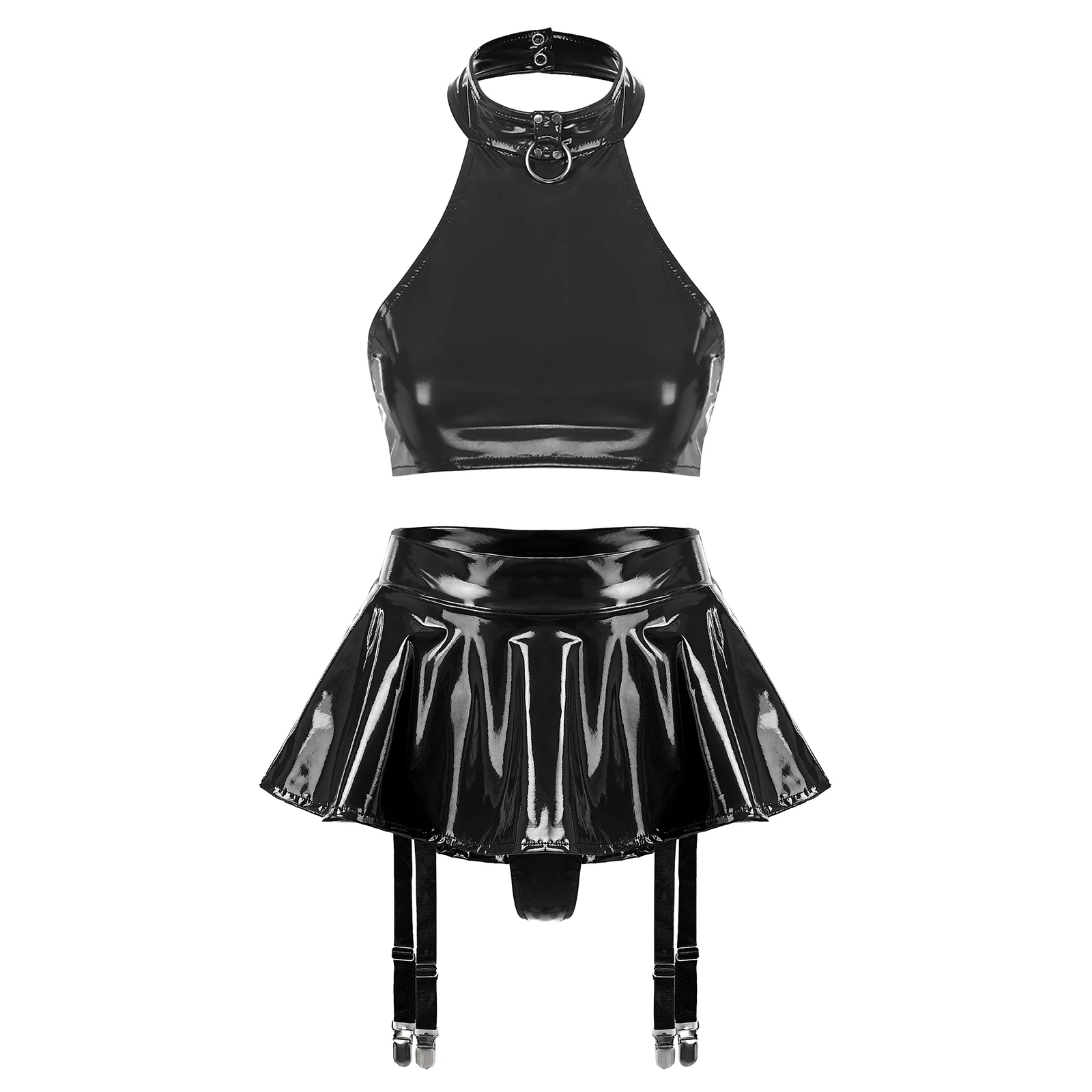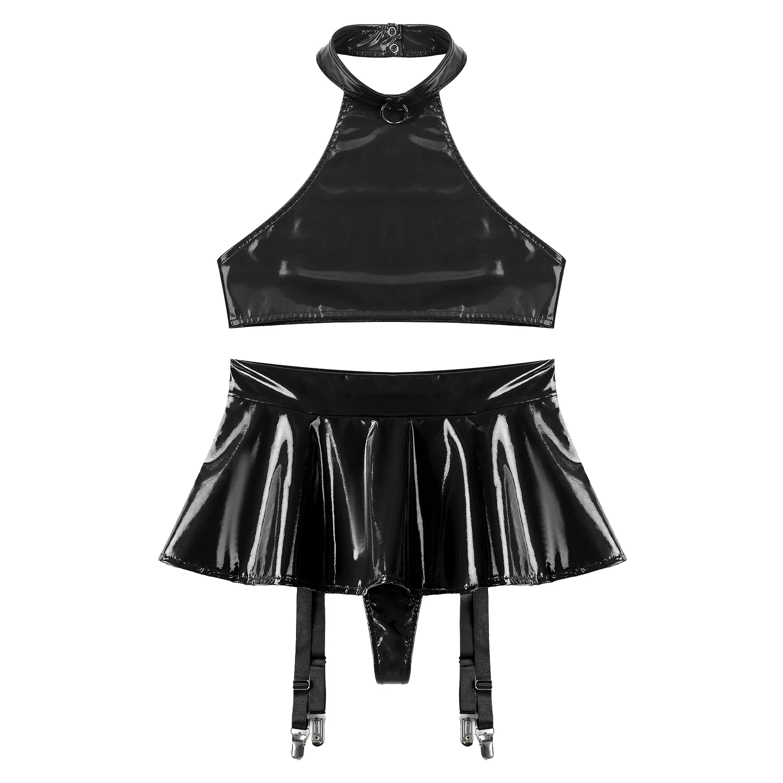 Womens Patent Leather Lingerie Set 2pcs Nightclub Rave Dance Outfit O Ring Halter Crop Top and Built-in Thongs Ruffle Miniskirts
