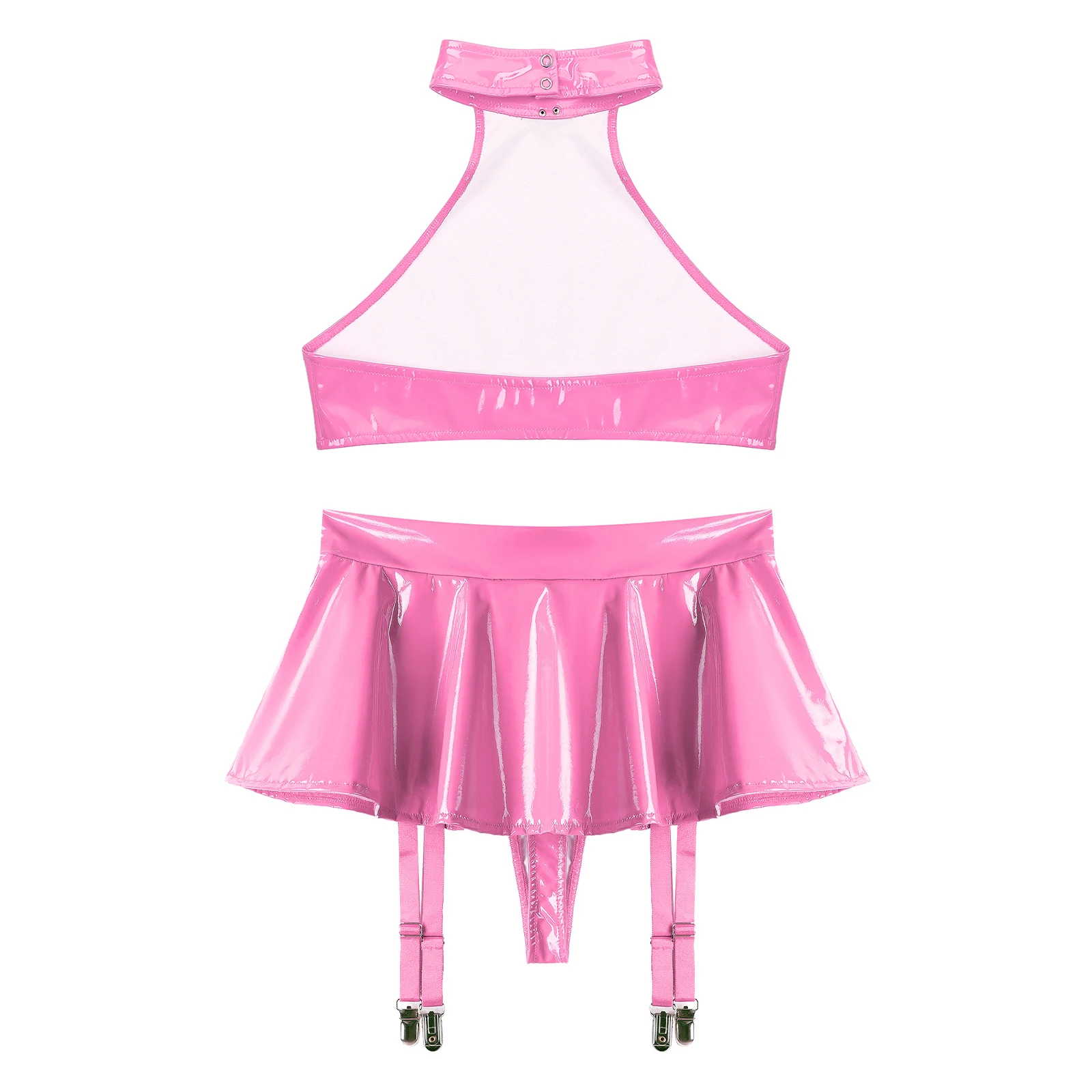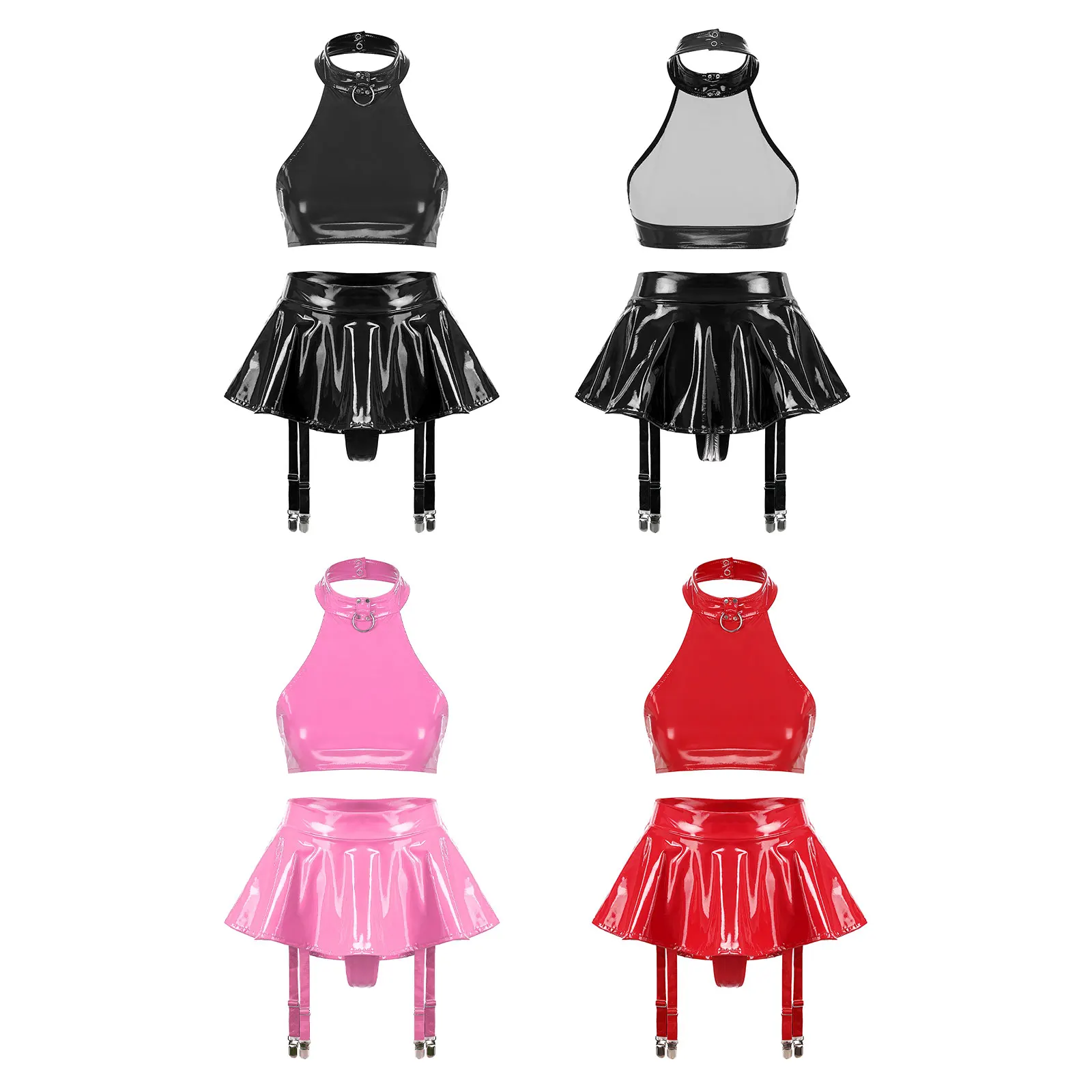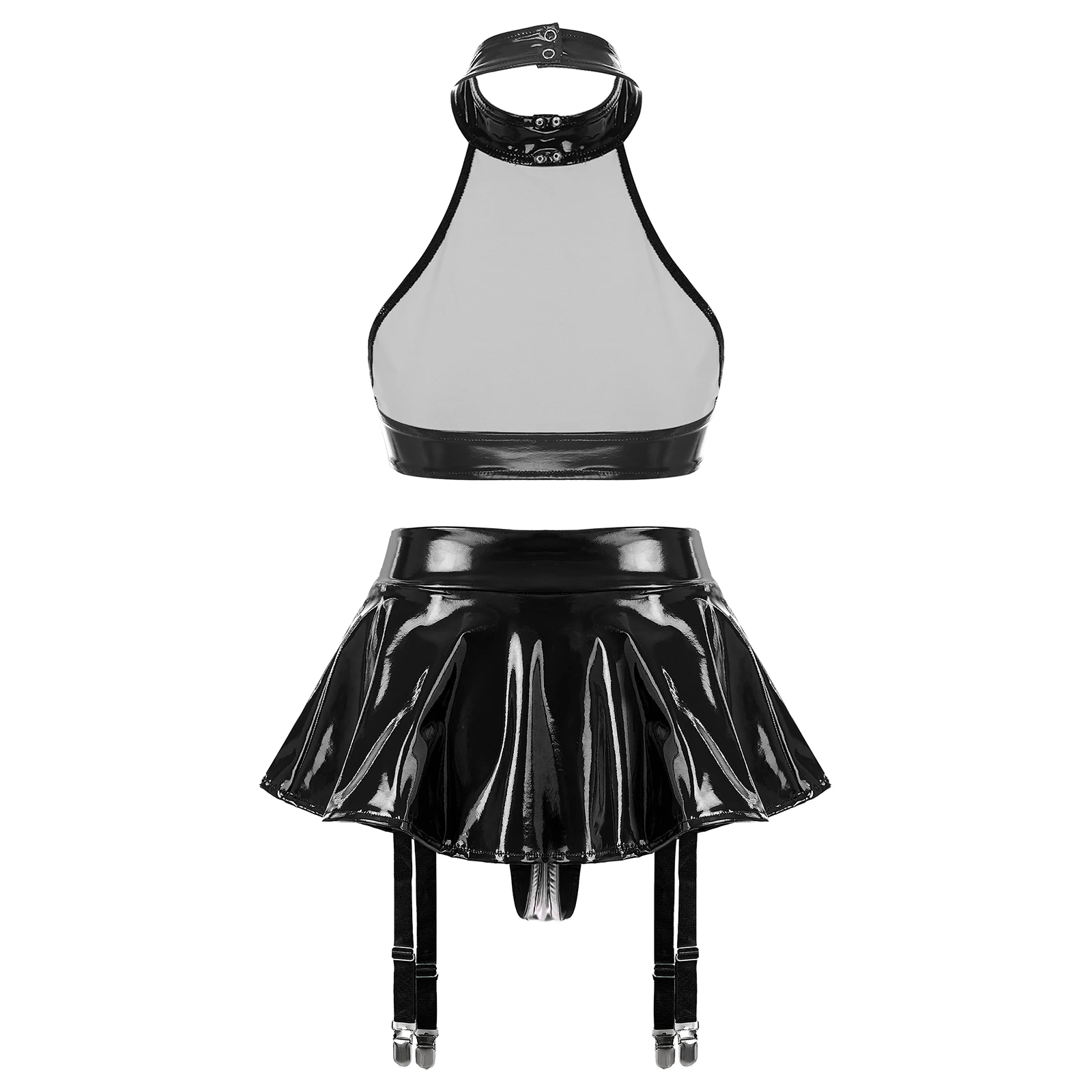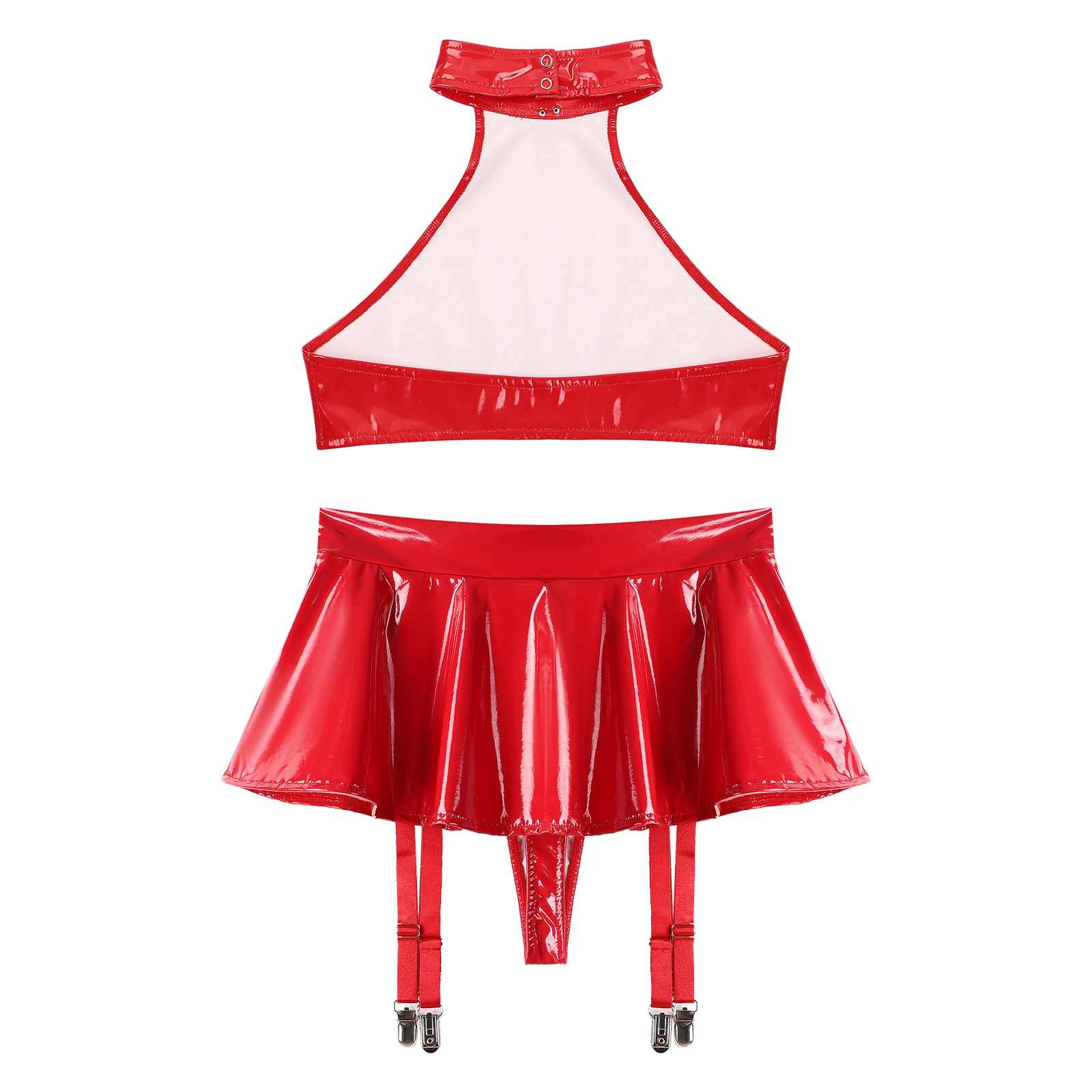 Womens Patent Leather Lingerie Set 2pcs Nightclub Rave Dance Outfit O Ring Halter Crop Top and Built-in Thongs Ruffle Miniskirts