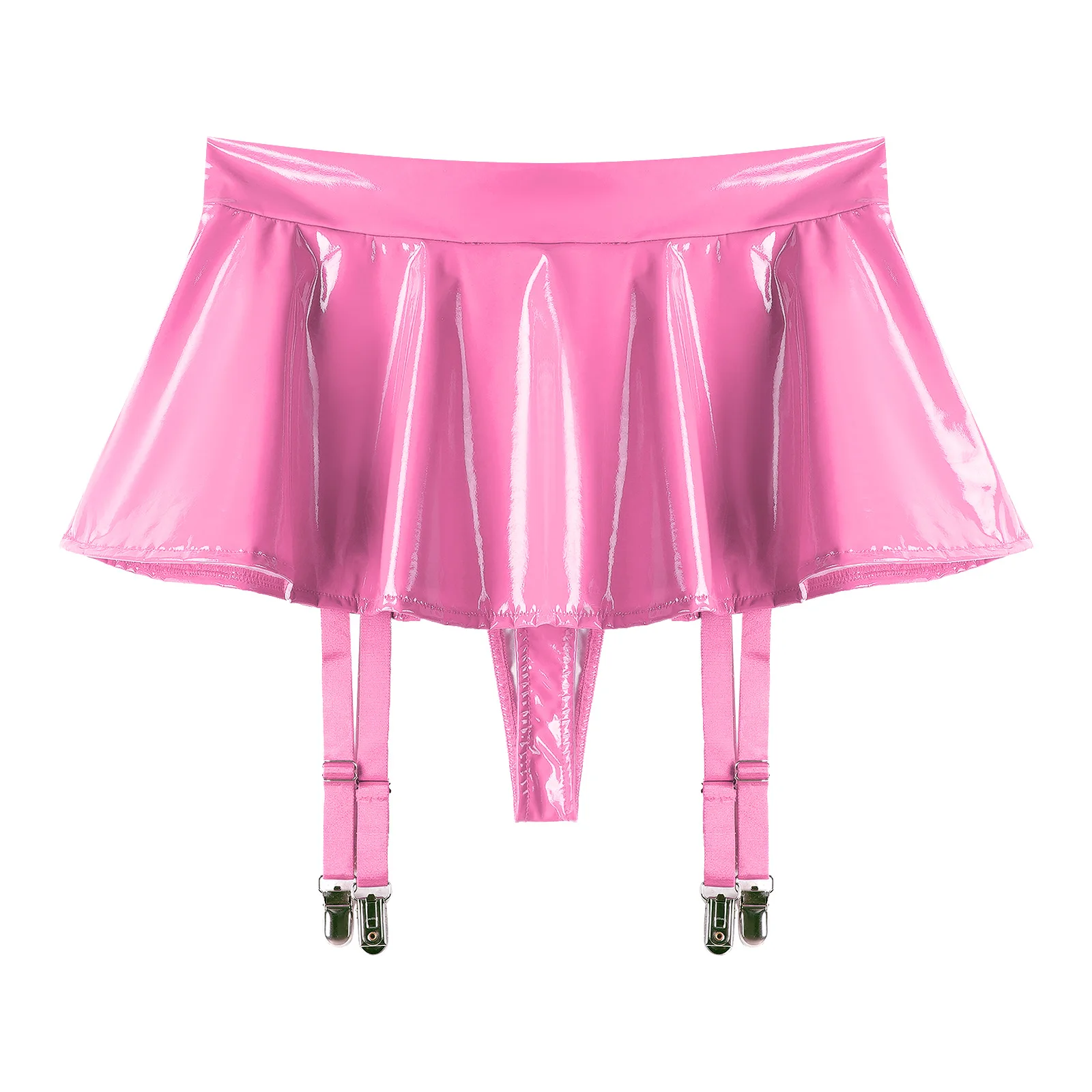 The mini skirt is designed with 4 adjustable garter belts and metal clips for holding the stockings in place.