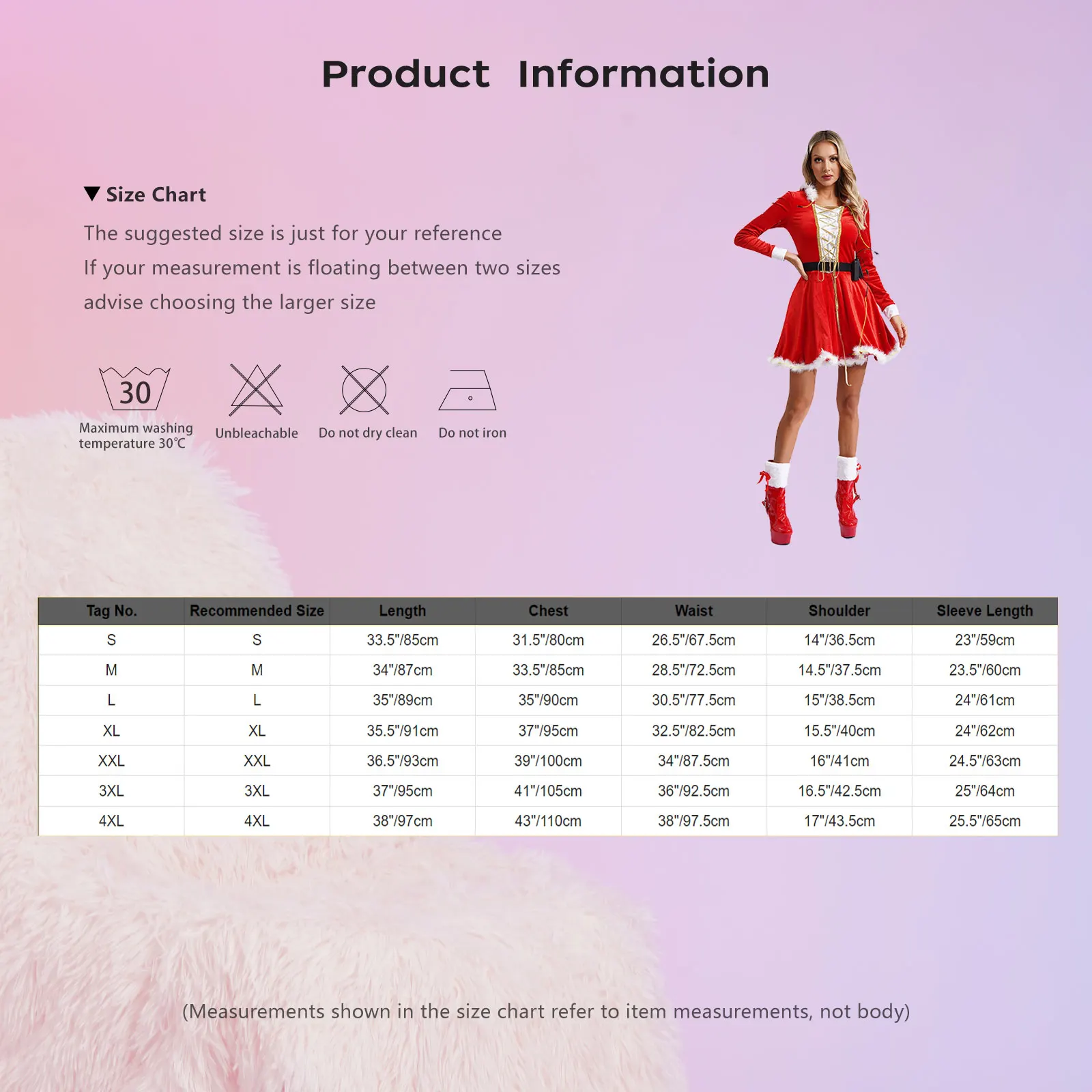 Size Chart: The suggested size is just for your reference. If your measurement is floating between two sizes, advise choosing the larger size. (Measurements shown in the size chart refer to item measurements, not body)