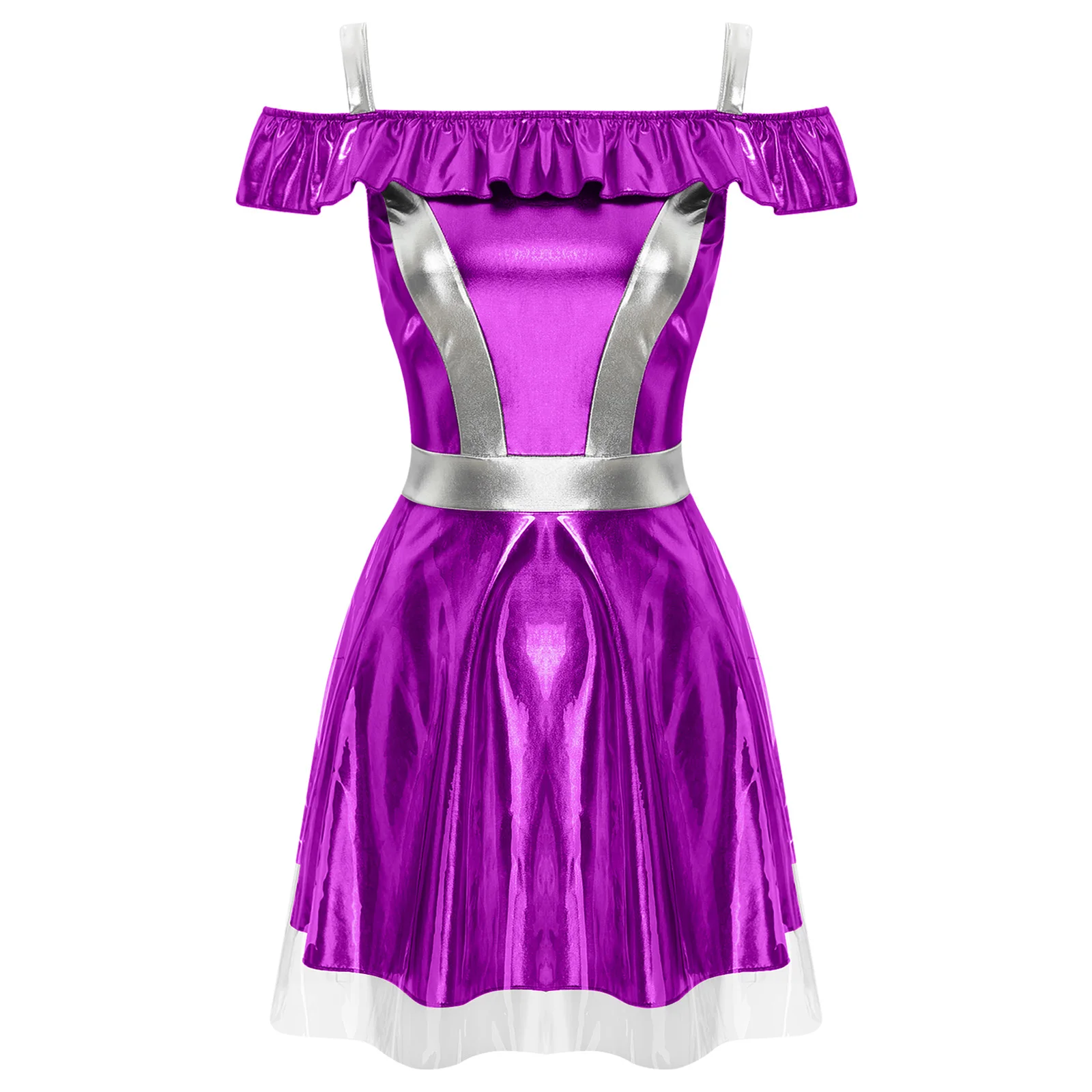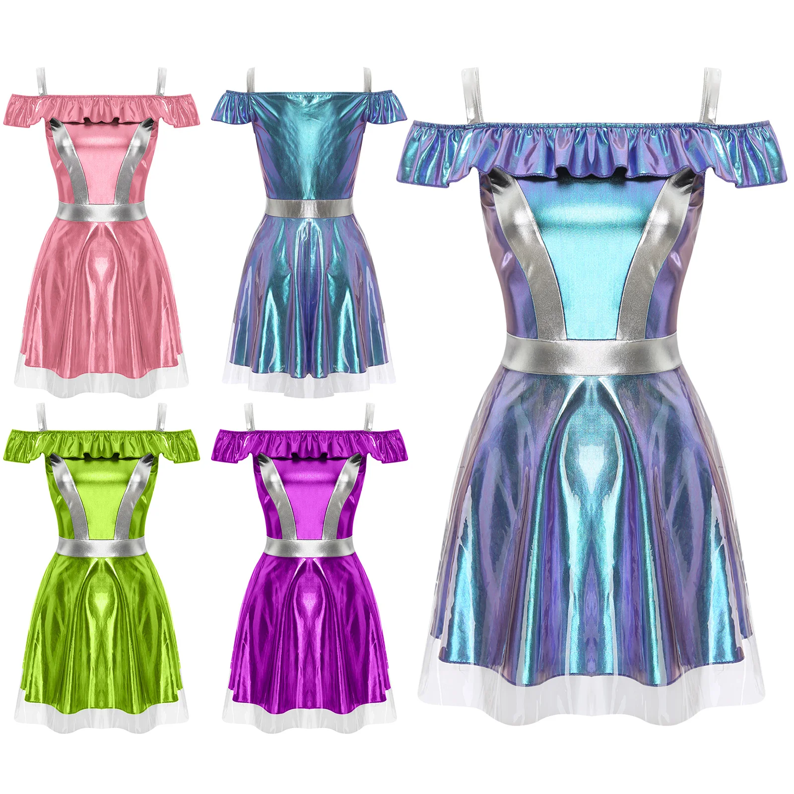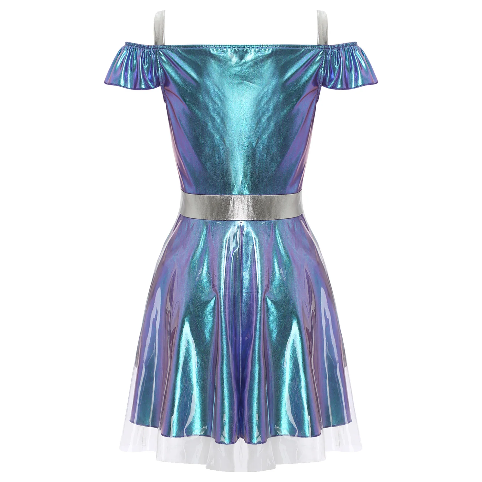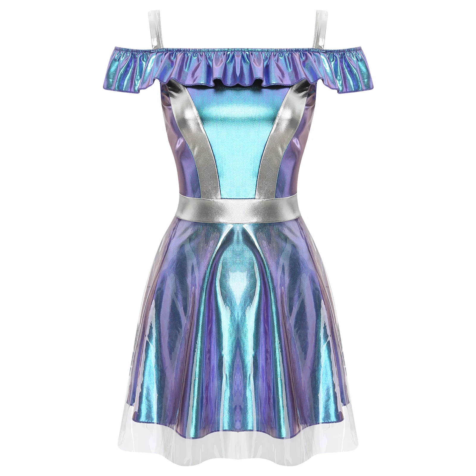 Womens Space Cadet Fighter Alien Dress Up Cosplay Costume Metallic Shiny Halloween Outfits Astronaut Robot Tulle Cami Dress