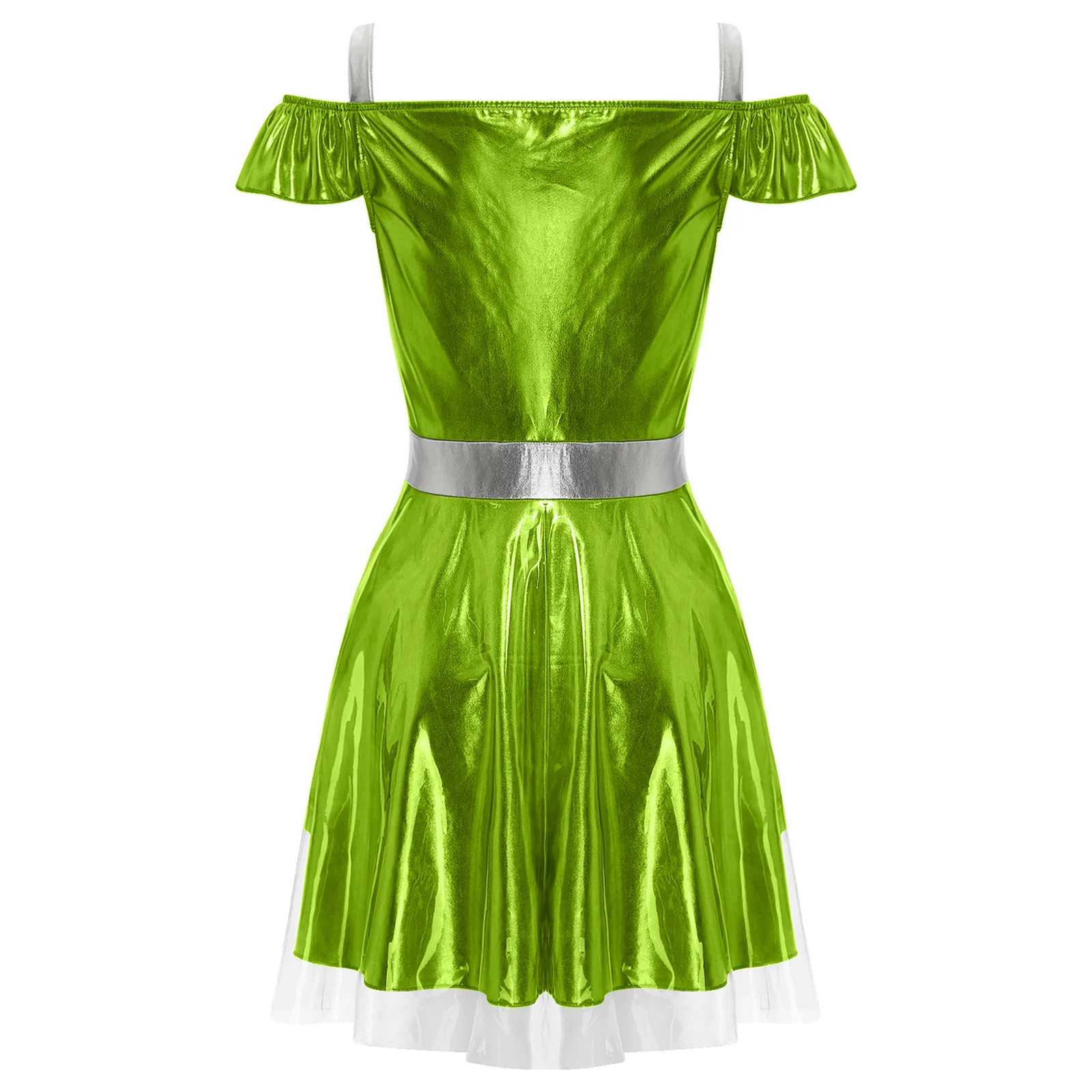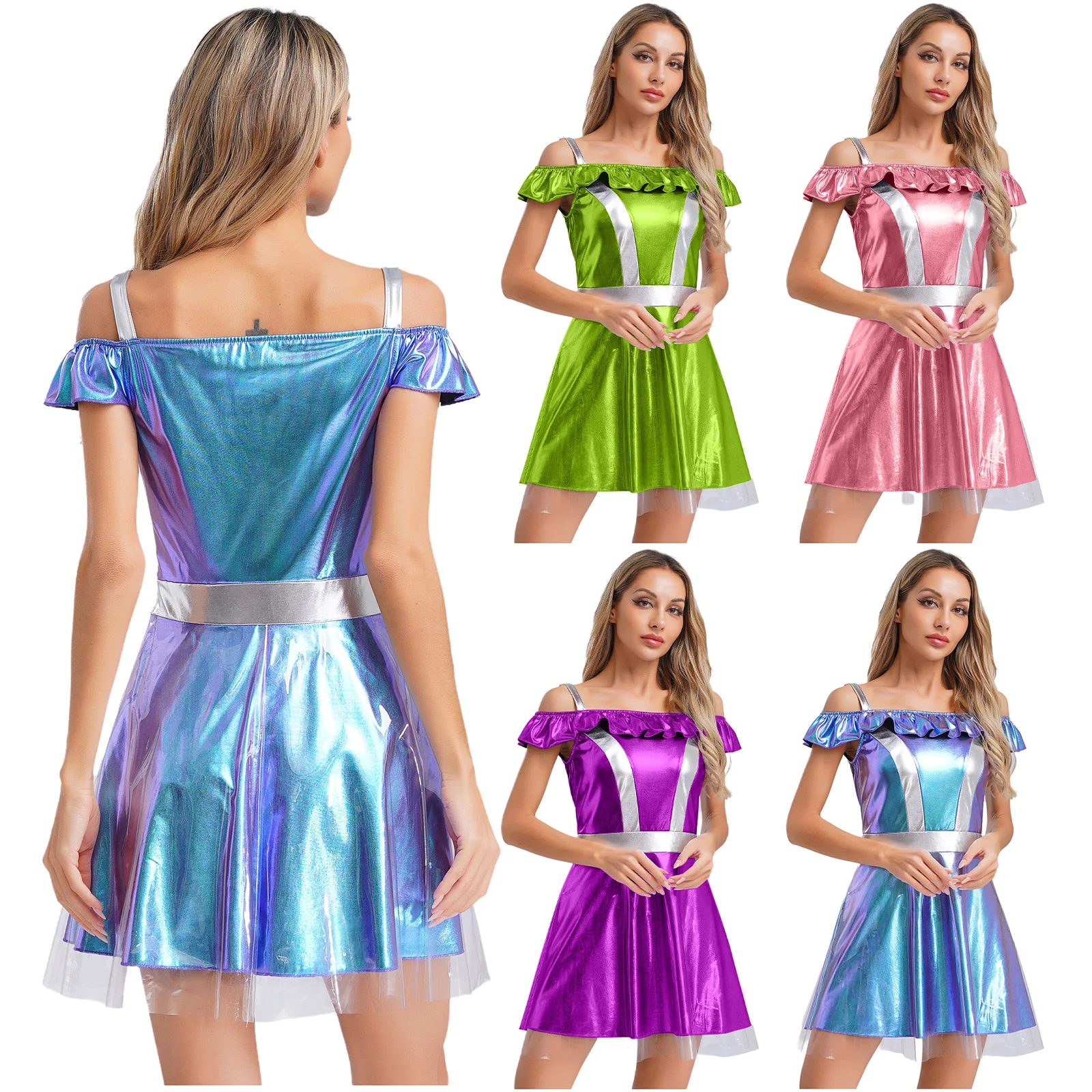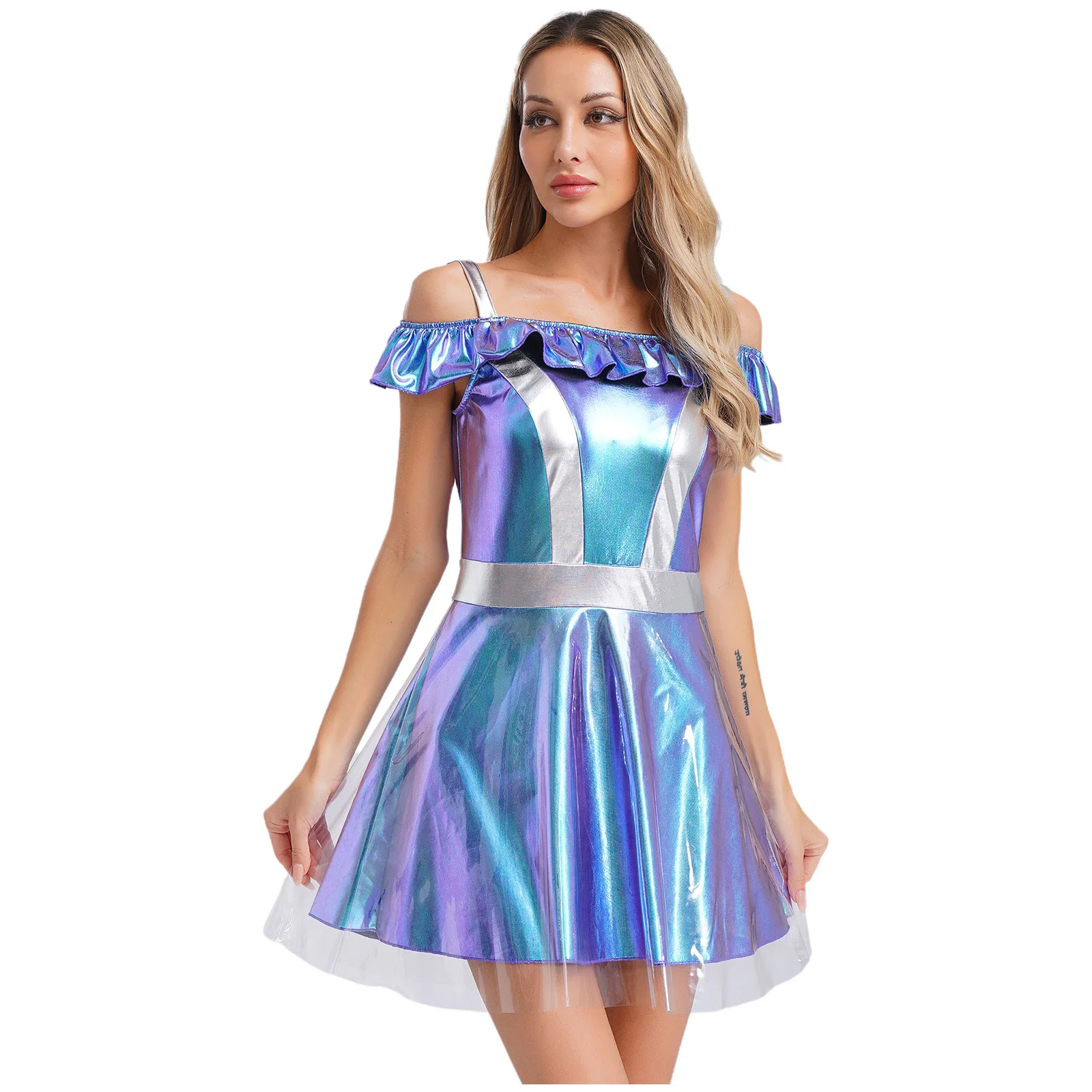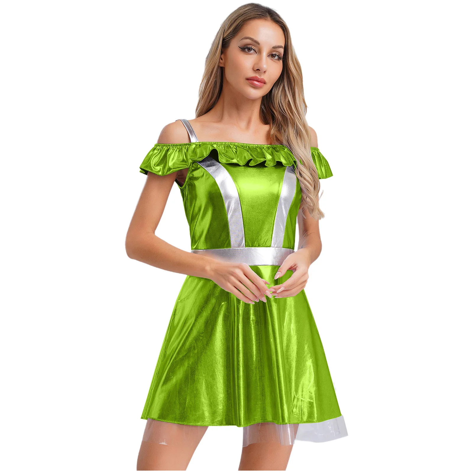 Cami dress styled alien costume for women, cold shoulder, ruffle collar, a-line short dress with a transparent layer.