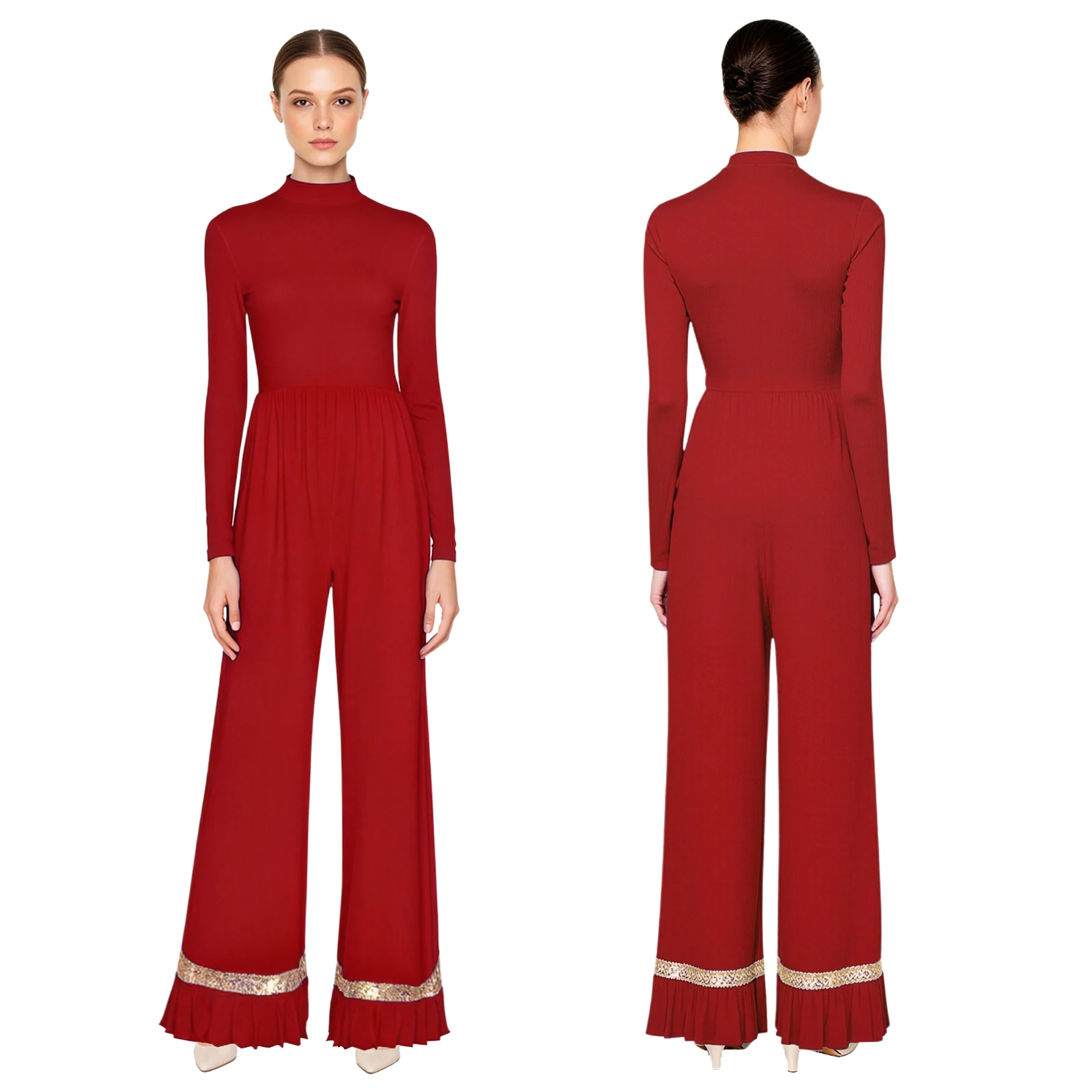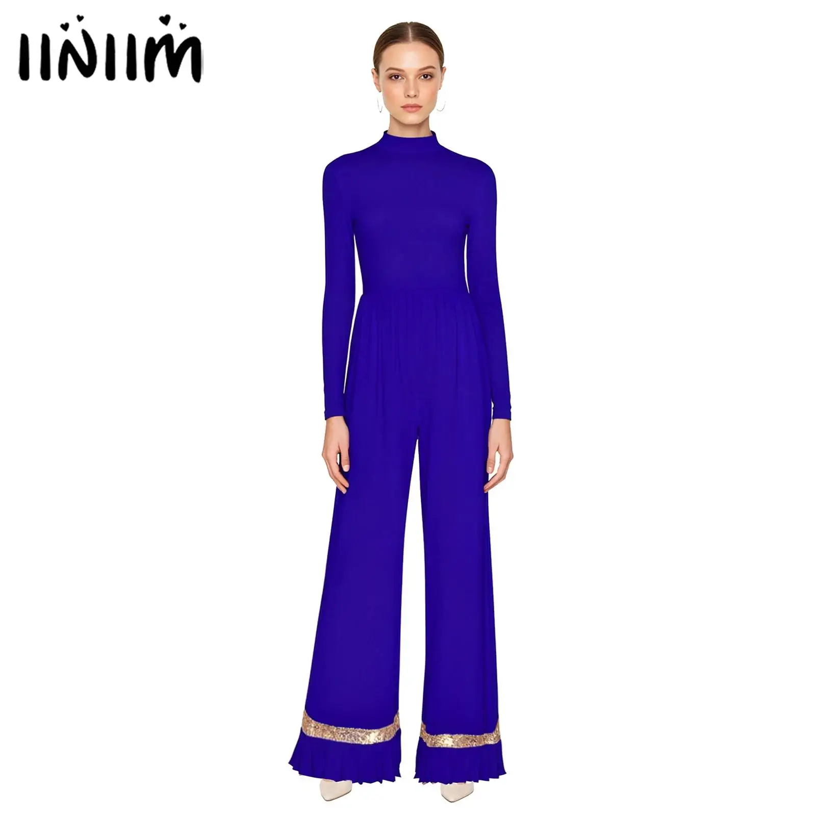 Womens Worship Praise Church Rompers Back Zip-up Shiny Sequin Ruffled Mesh Trim Wide Leg Pants Jumpsuit Lyrical Dance Costume